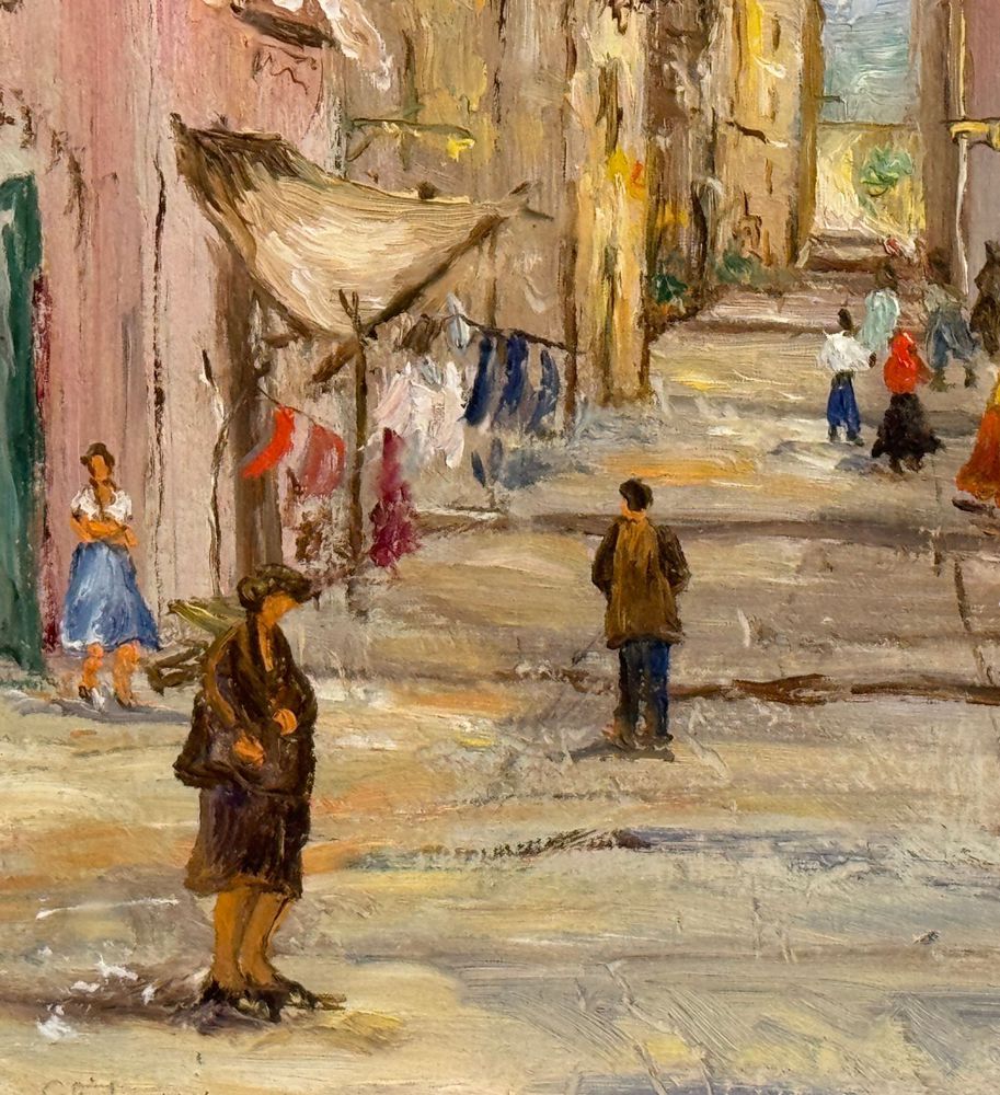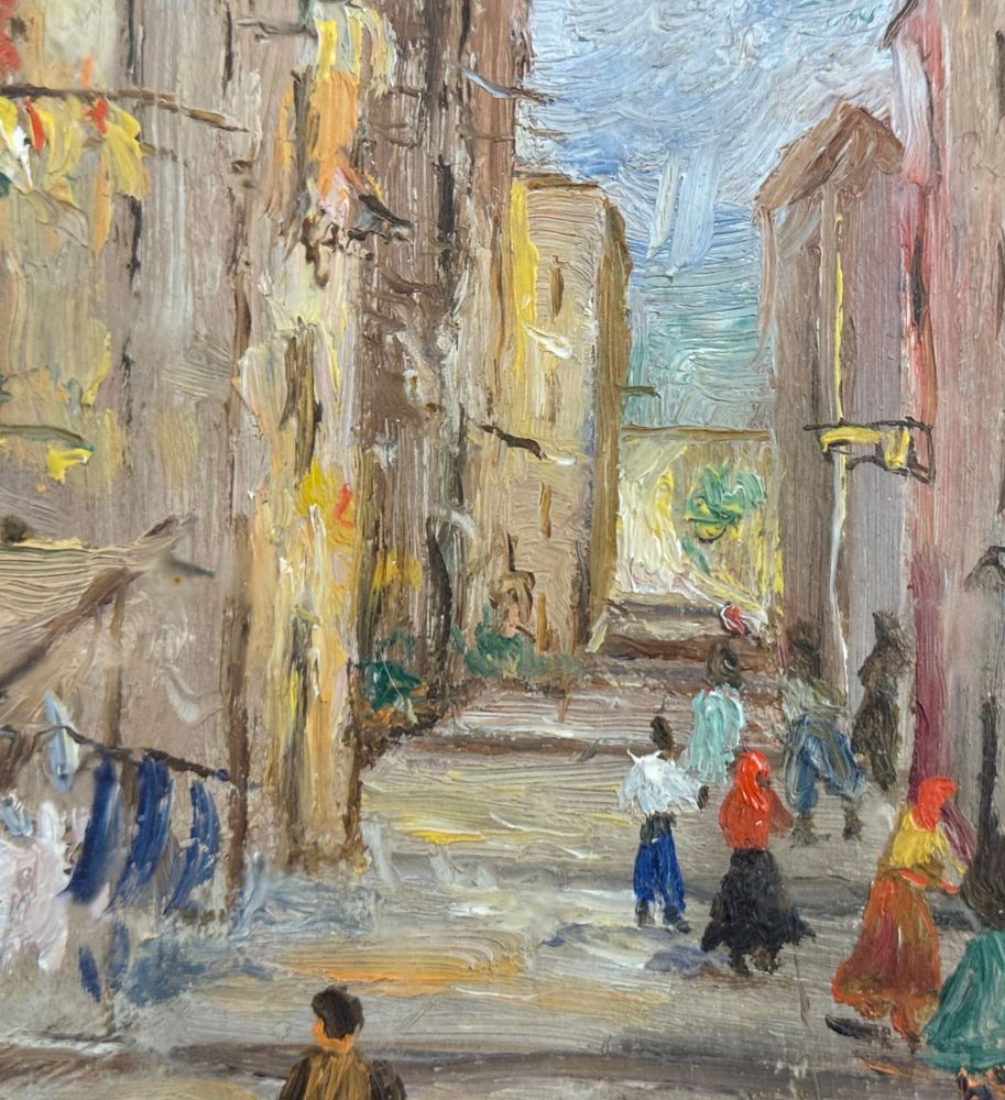 Dipinto olio su tavola, periodo XX secolo scuola Italiana, raffigurante Strada con personaggi. Dimensioni compreso cornice: 34x50 cm. Dimensioni interno cornice: 22x37 cm. Reca firma in basso a sinistra da artista non identificato. Opera in buone condizioni.