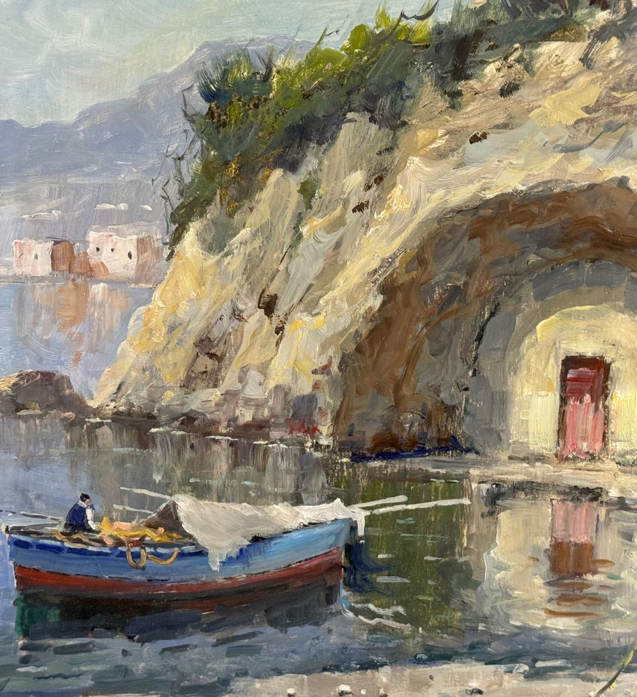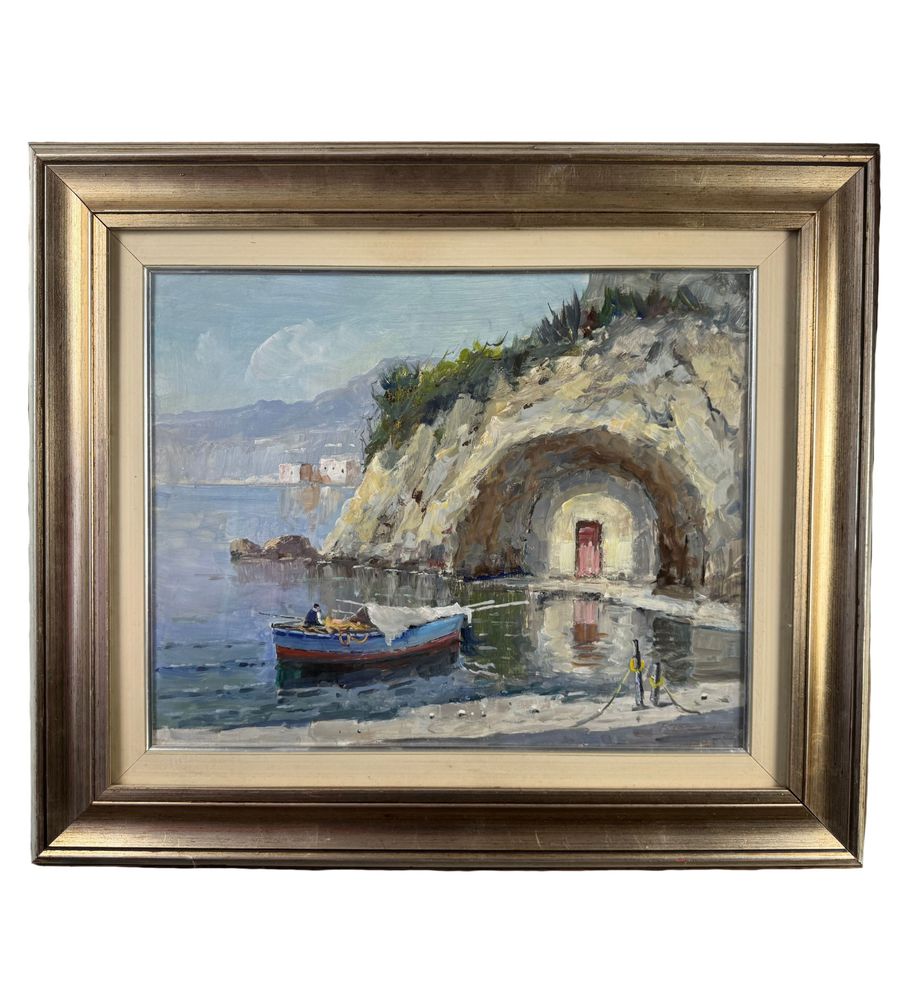 Dipinto olio su pannello, periodo XX secolo scuola Italiana, raffigurante Scorcio di marina partenopea. Dimensioni compreso cornice: 72x52 cm. Dimensioni interno cornice: 50x40 cm. Reca firma in basso a destra da R. Tozzi. Opera in buone condizioni.