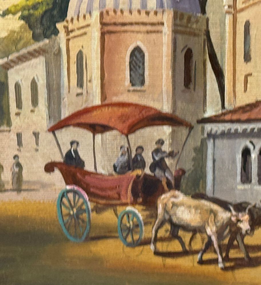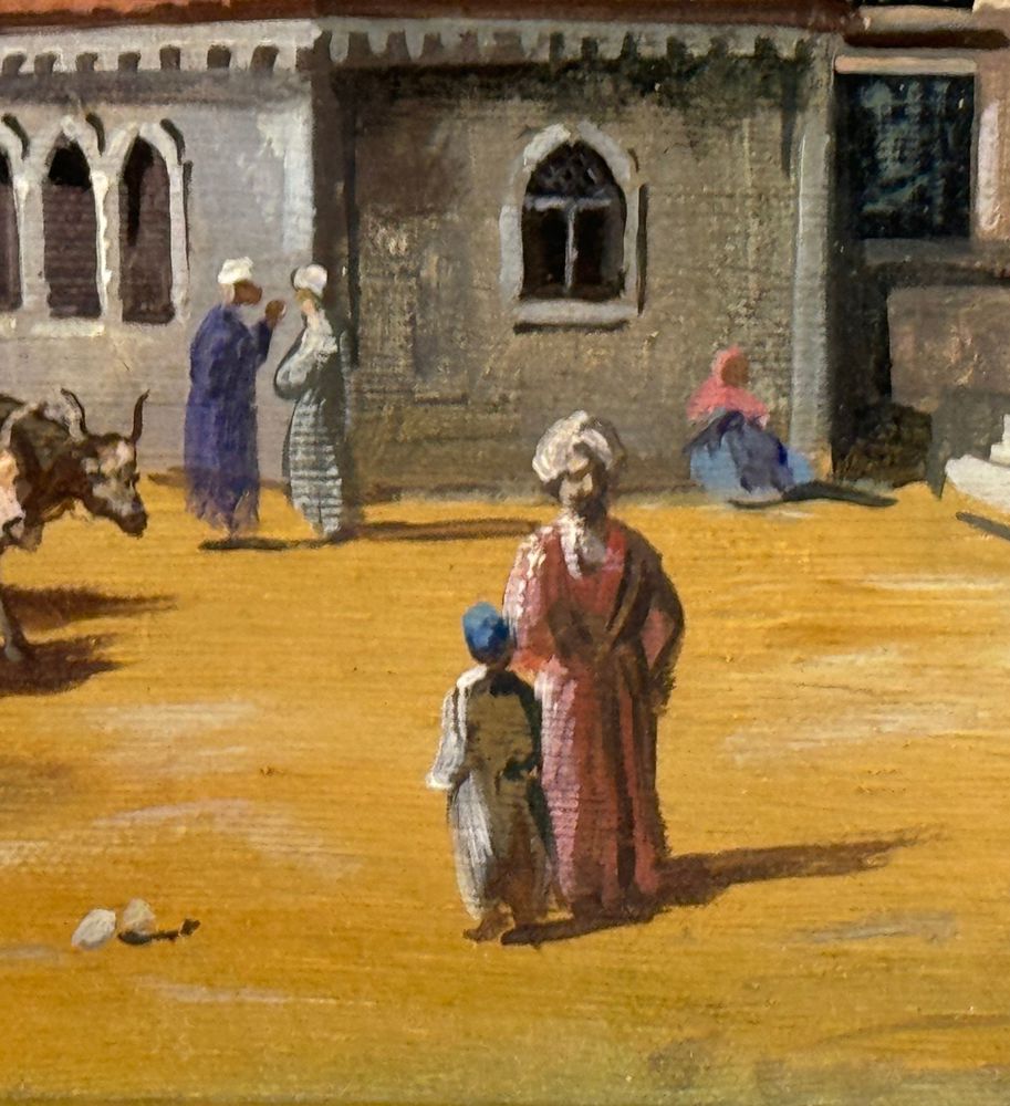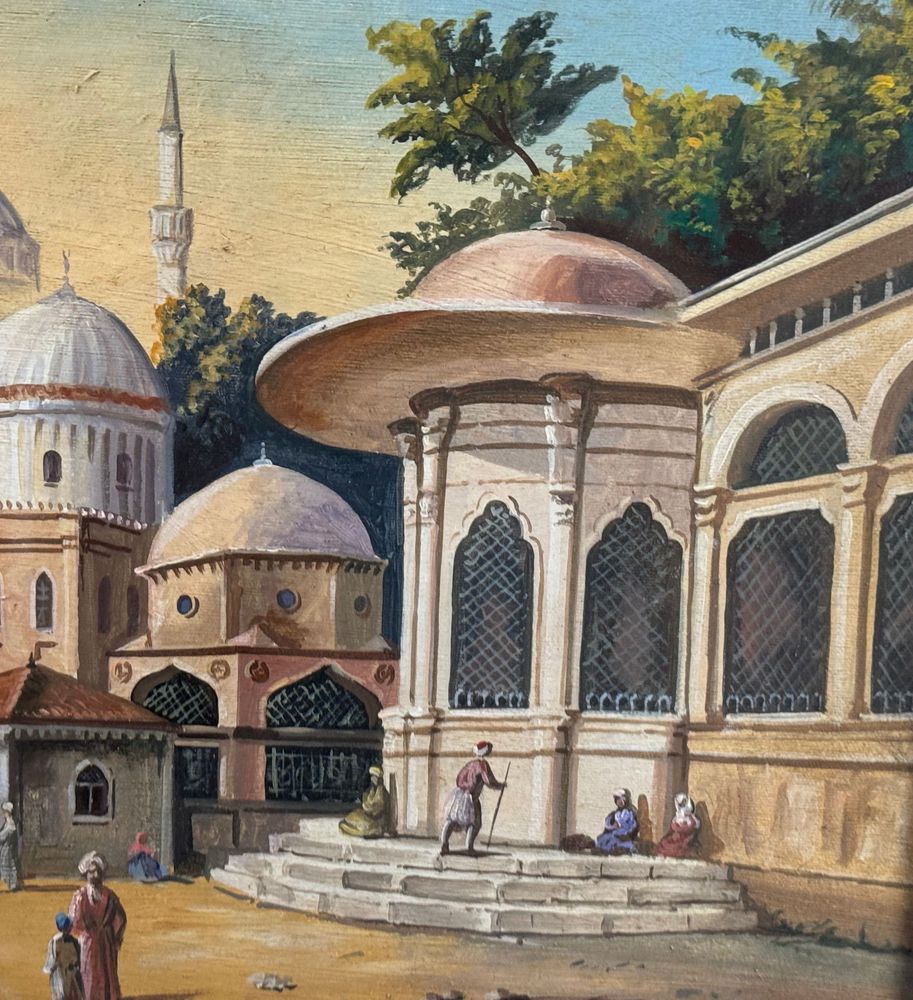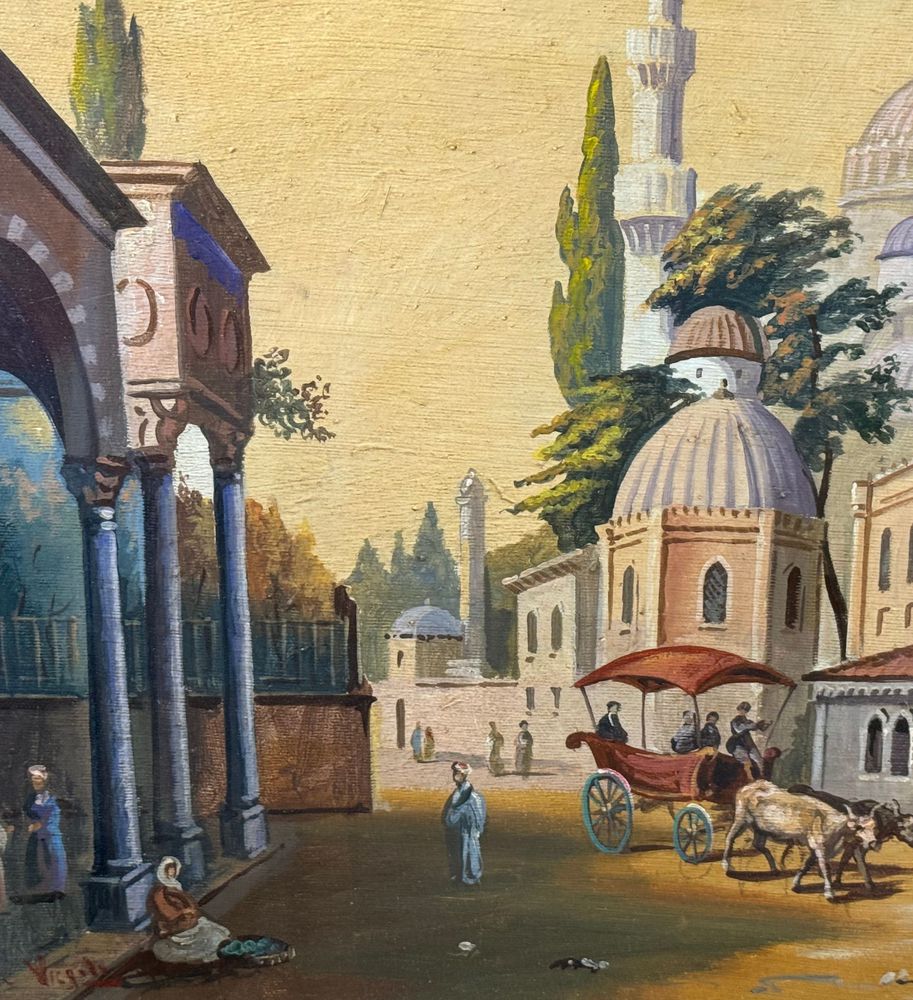 Dipinto olio su tela, periodo prima metà del XX secolo scuola Europea, raffigurante Strada con personaggi a Istanbul. Dimensioni compreso cornice: 93x73 cm. Dimensioni interno cornice: 70X50 cm. Reca firma in basso a sinistra da artista non identificato. Opera in buone condizioni.