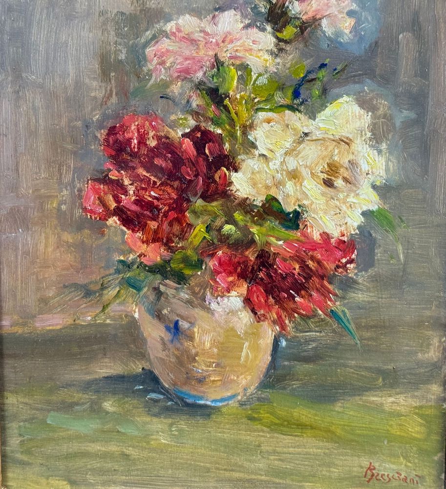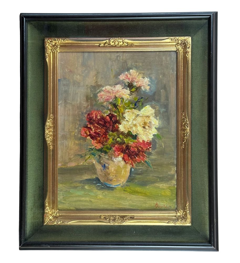 Dipinto olio su pannello, periodo XX secolo scuola Italiana, raffigurante Vaso con fiori. Dimensioni compreso cornice: 49x59 cm. Dimensioni interno cornice: 30x40 cm. Reca firma in basso a destra da Bresciani. Opera in buone condizioni.