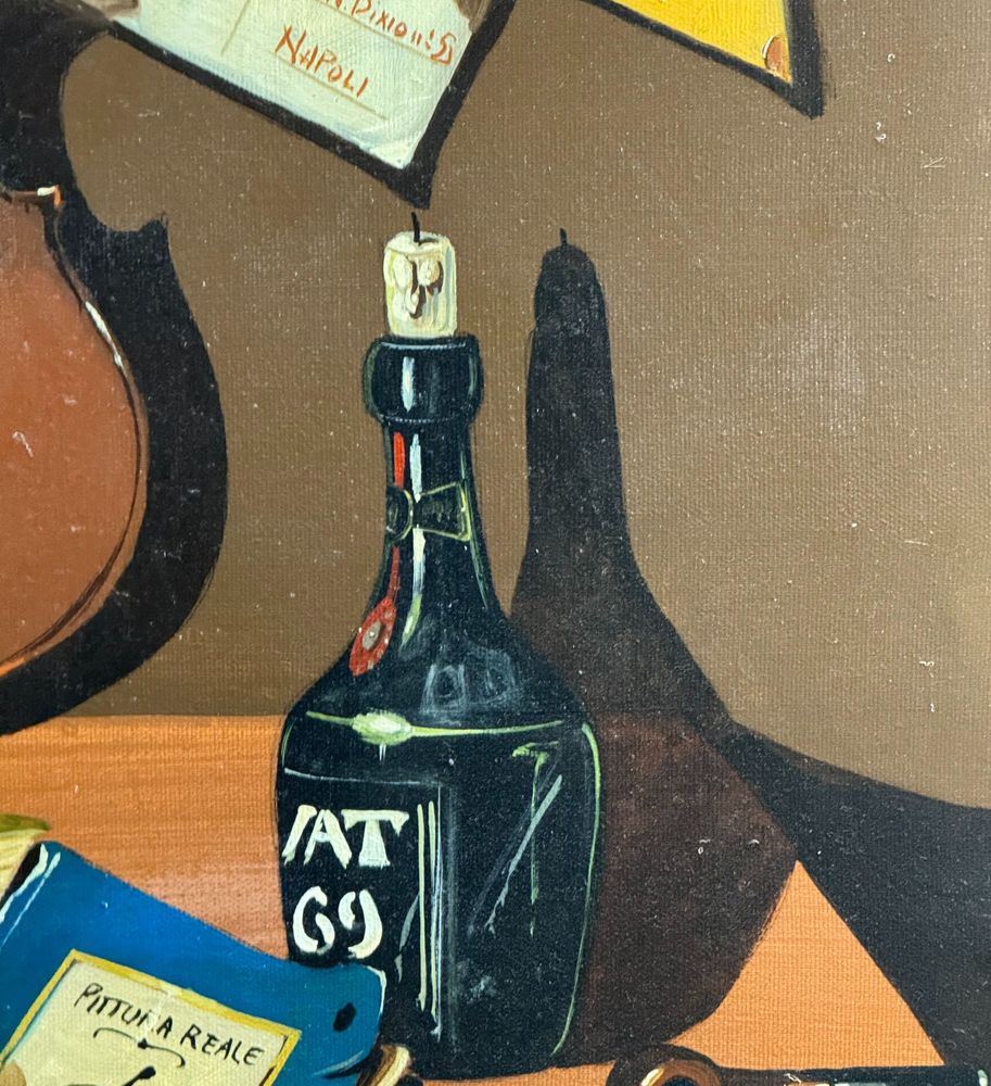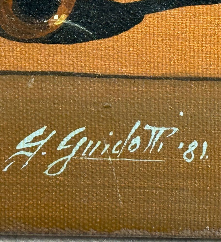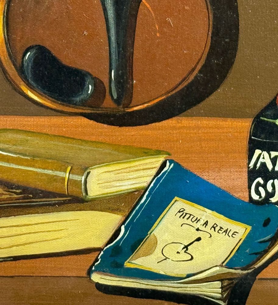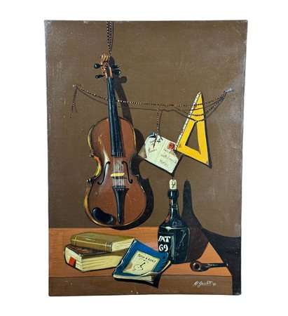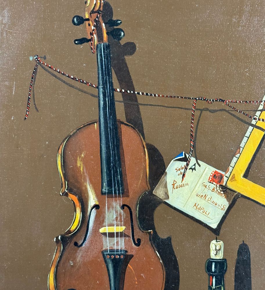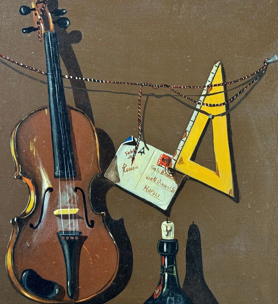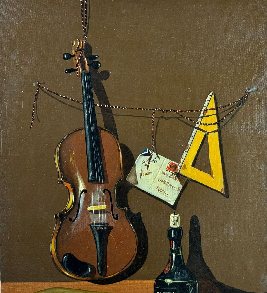 Dipinto olio su tela, periodo XX secolo scuola Italiana, raffigurante Violino e oggettistica. Dimensioni: 70x50 cm. Reca firma in basso a destra da G. Guidotti. Opera in buone condizioni.