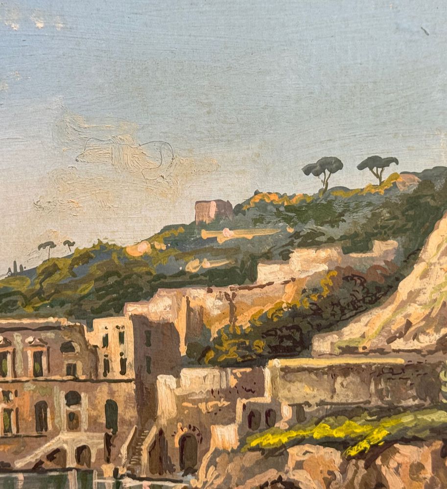 Dipinto guazzo (tempera su carta), periodo prima metà del XX secolo scuola italiana, raffigurante Veduta di Palazzo Donn'Anna a Posillipo. Dimensioni: 45x29 cm. Reca firma in basso a destra da Gianni. Opera in buone condizioni con lievi segni di vissuto come da foto allegate.