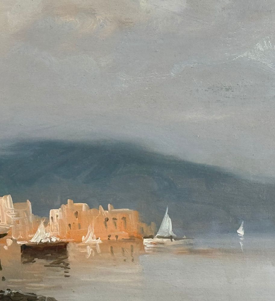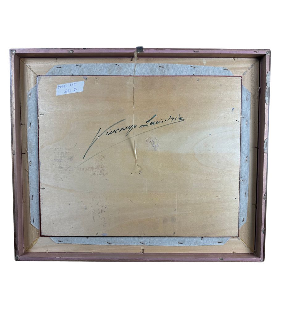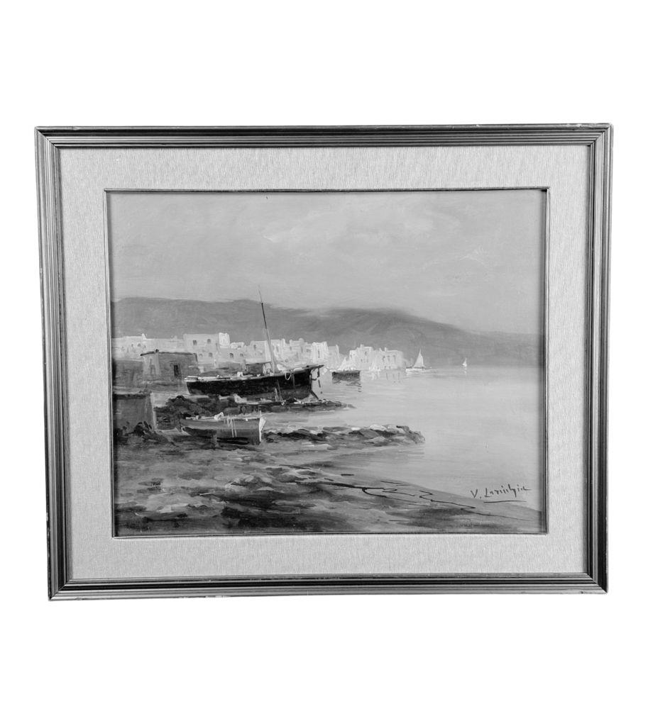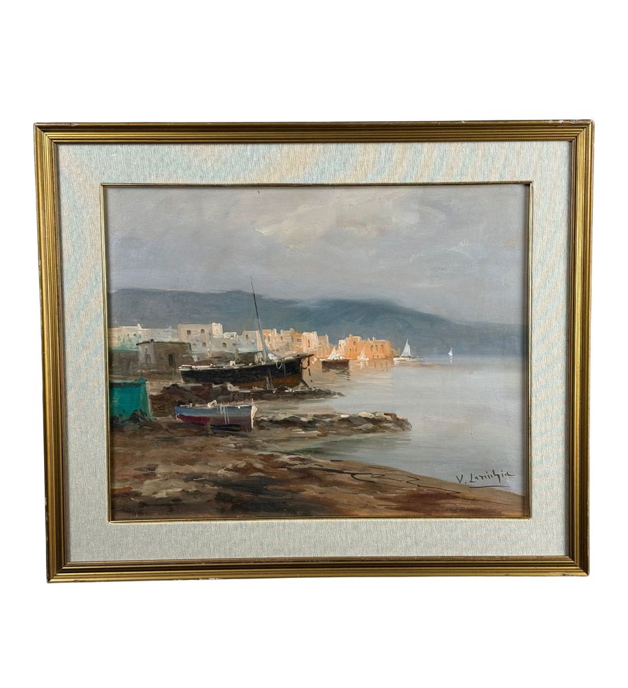 Dipinto olio su tavola, periodo XX secolo scuola Italiana, raffigurante Marina partenopea. Dimensioni compreso cornice: 63x52 cm. Dimensioni interno cornice: 50x40 cm. Reca firma in basso a destra e autentica sul retro da Vincenzo Laricchia (1940). Opera in buone condizioni.