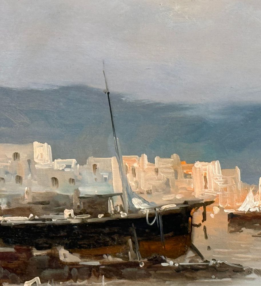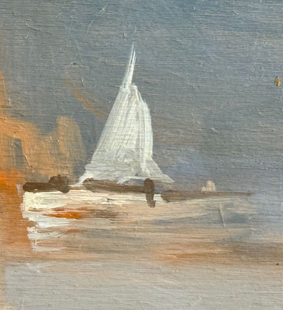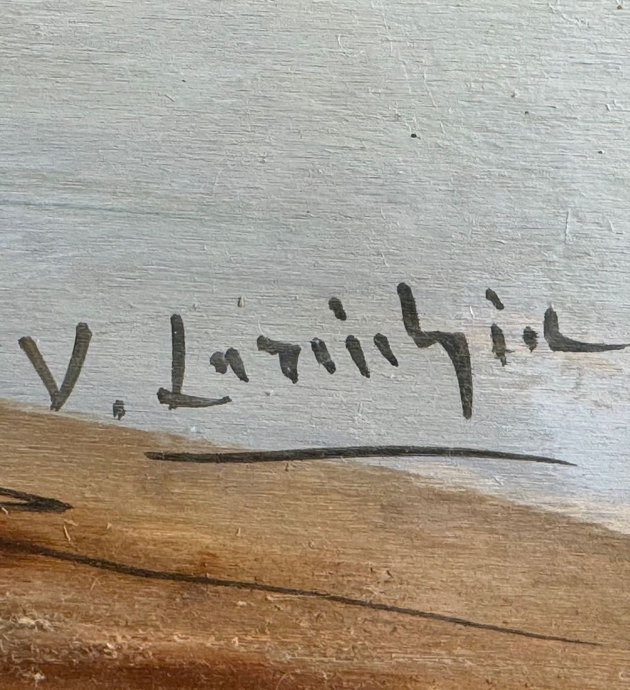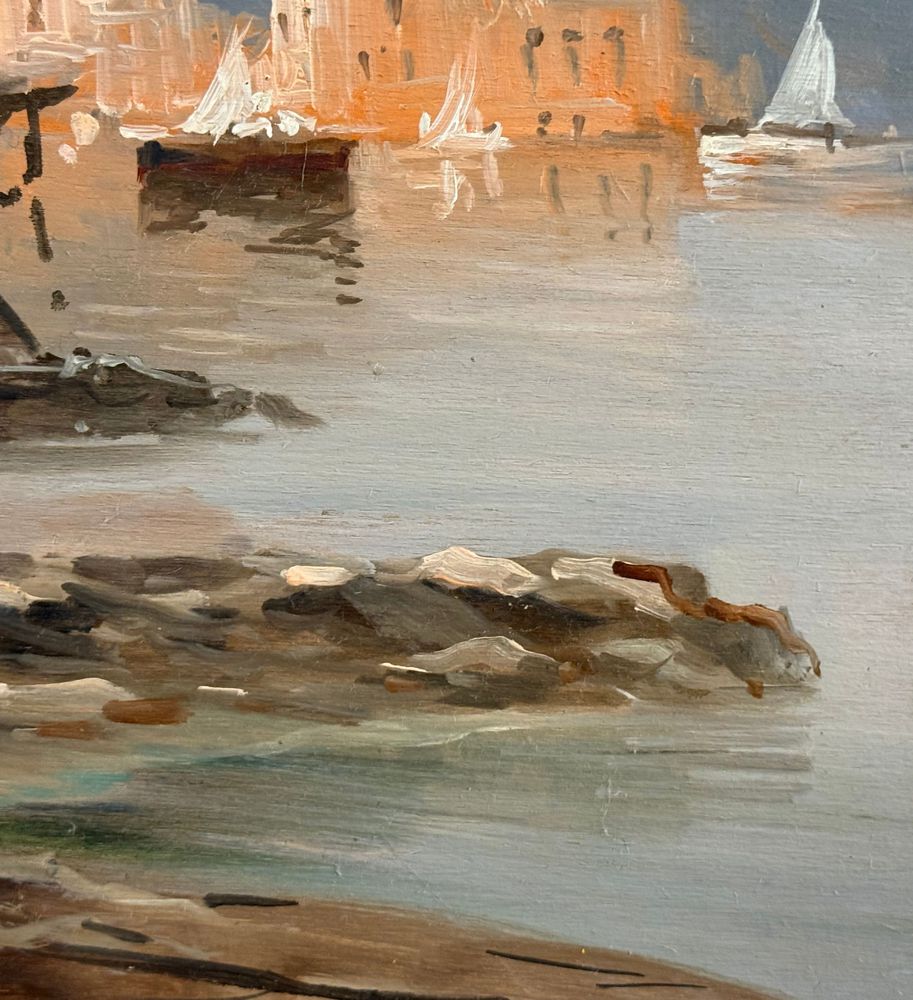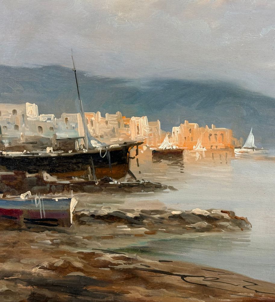 Dipinto olio su tavola, periodo XX secolo scuola Italiana, raffigurante Marina partenopea. Dimensioni compreso cornice: 63x52 cm. Dimensioni interno cornice: 50x40 cm. Reca firma in basso a destra e autentica sul retro da Vincenzo Laricchia (1940). Opera in buone condizioni.