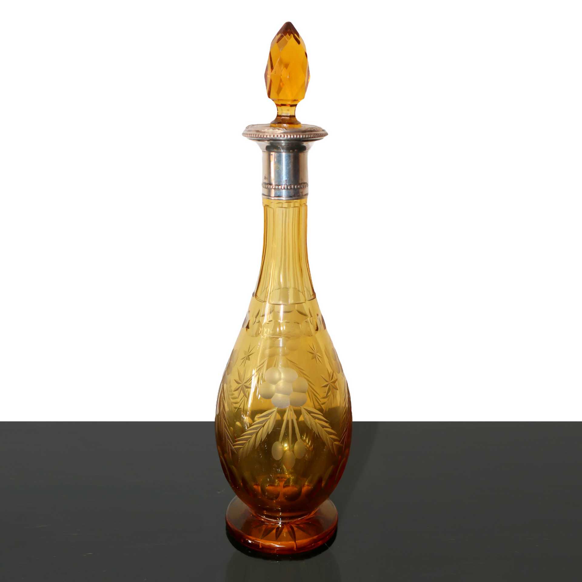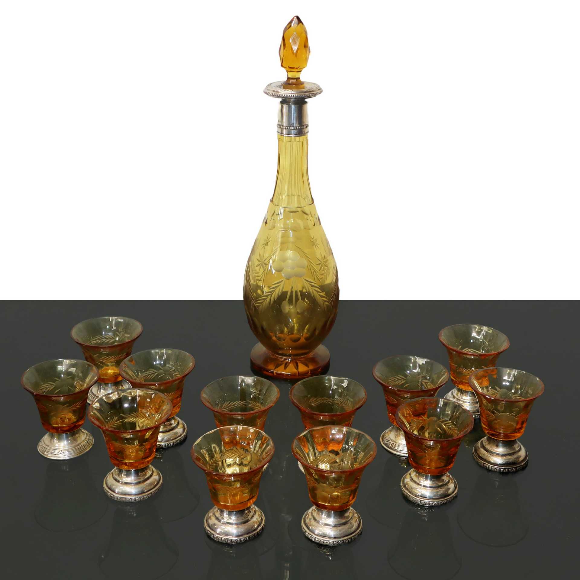 Servizio da liquore in vetro nei toni del pagliesco ed argento 800 Composto da bottiglia e 12 bic
