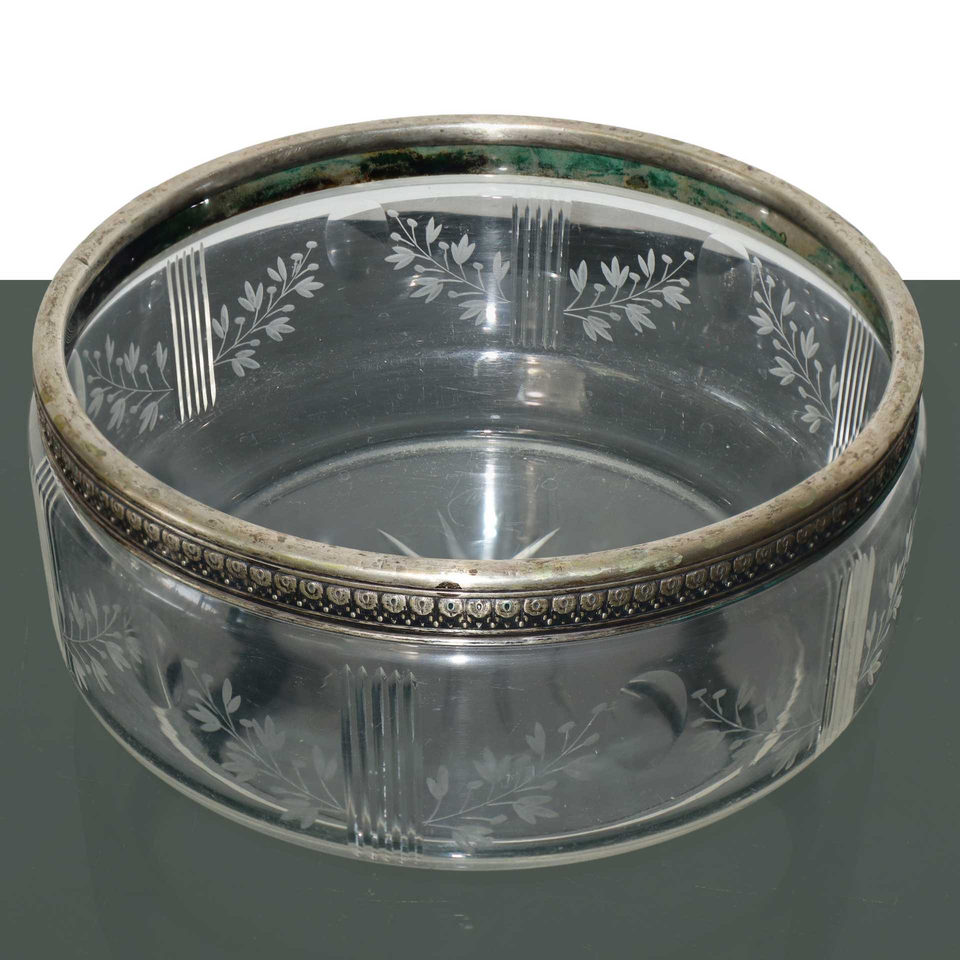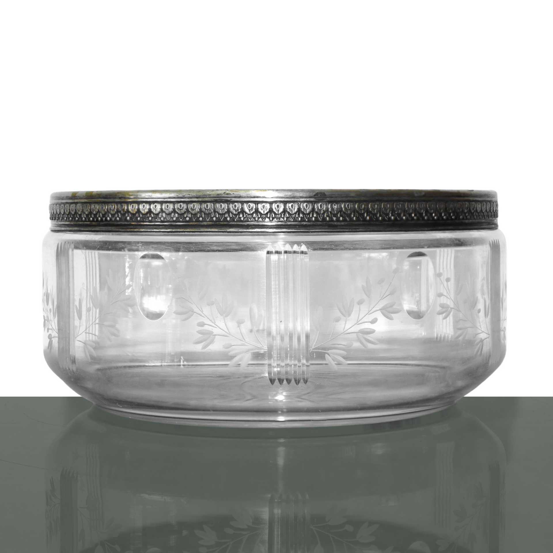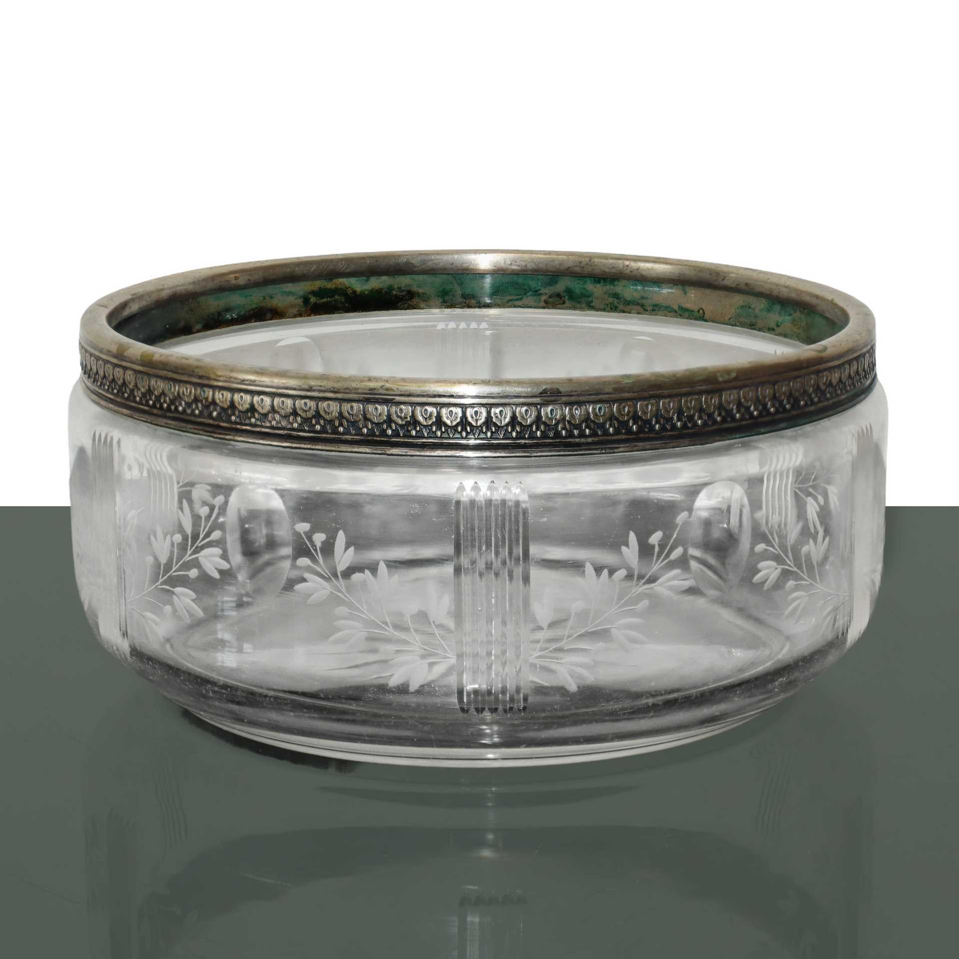Centrotavola fruttiera in vetro serigrafato e metallo, 20° secolo h cm 10 diametro cm 19,5