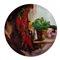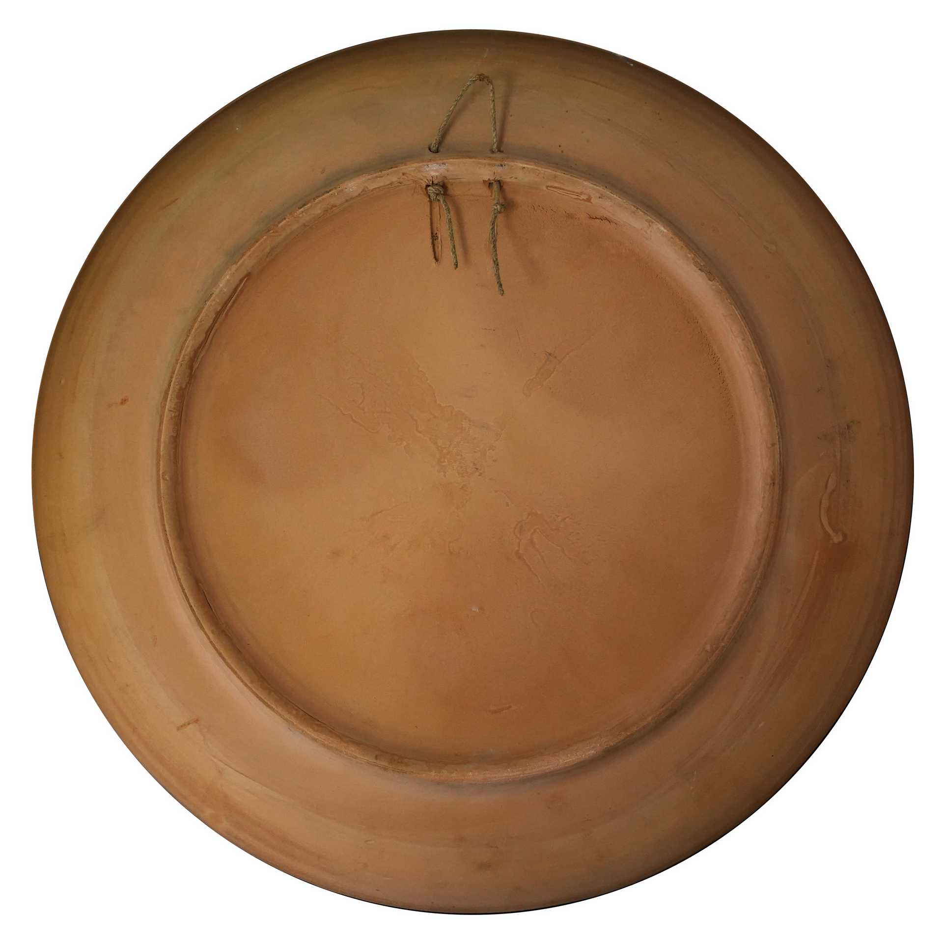Piatto in terracotta policromo con decorazione di peperoncini e vaso fiorito