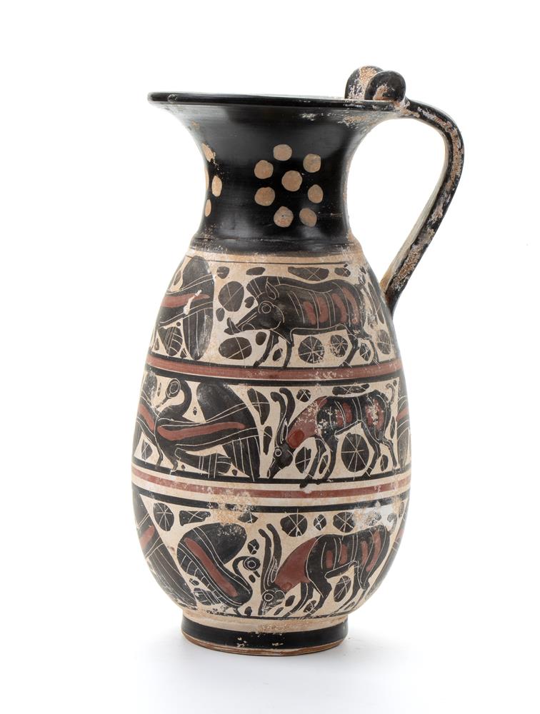 Coppia di versatoi ansati in ceramica arcaica con decori zoomorfi a figre nere nelle tre fasce XX secolo