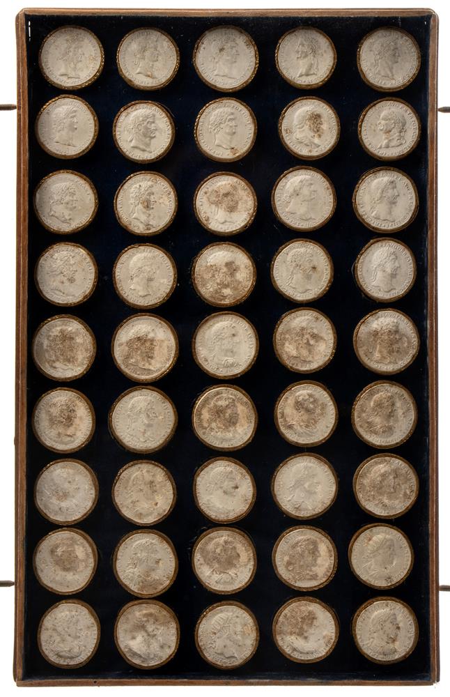 Teca in ferro patinato nero e trasparente conteneenti riproduzioni di antiche monete romane in gesso