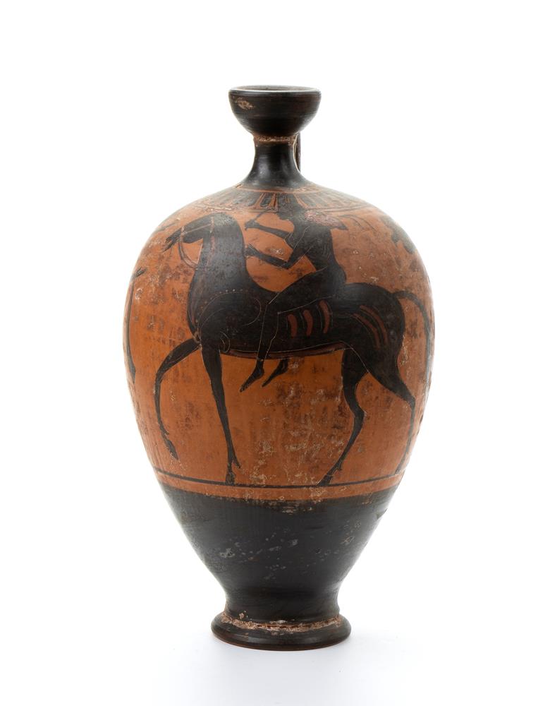 Oinochoe in ceramica a figure nere con commiato ad un guerriero a cavallo