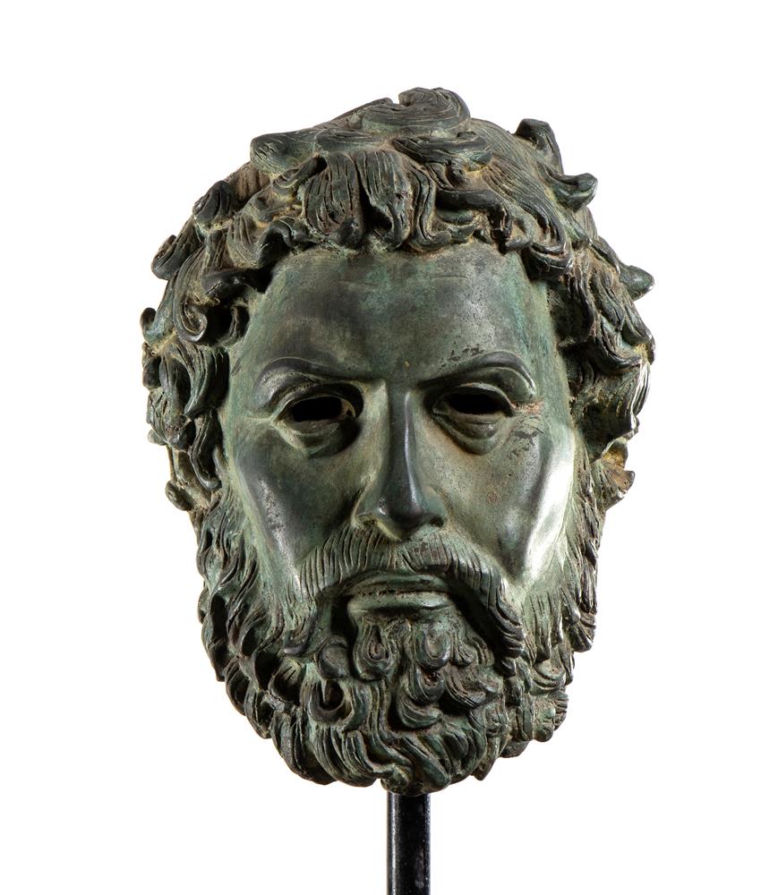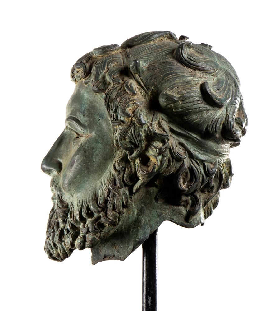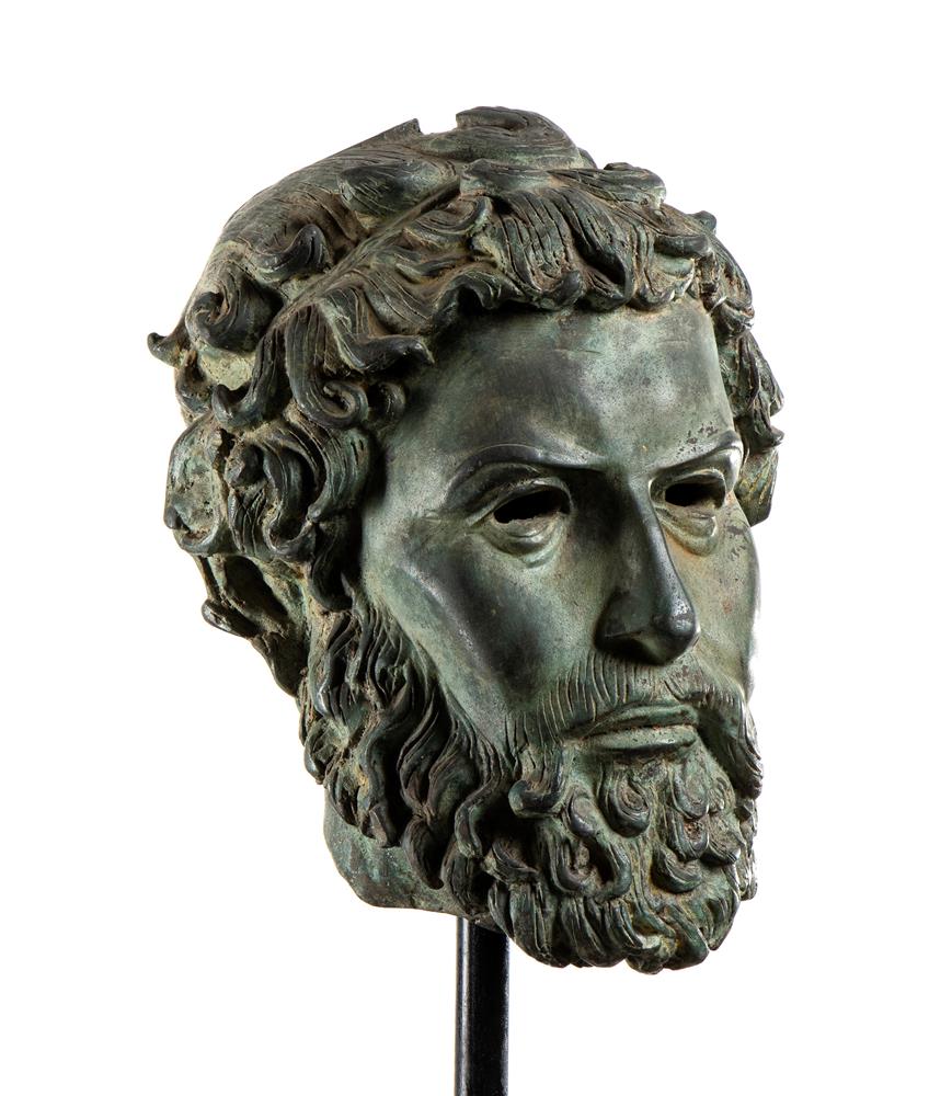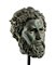 Testa in guerriero greco in bronzo assicurata ad una base in marmo nero quadrata