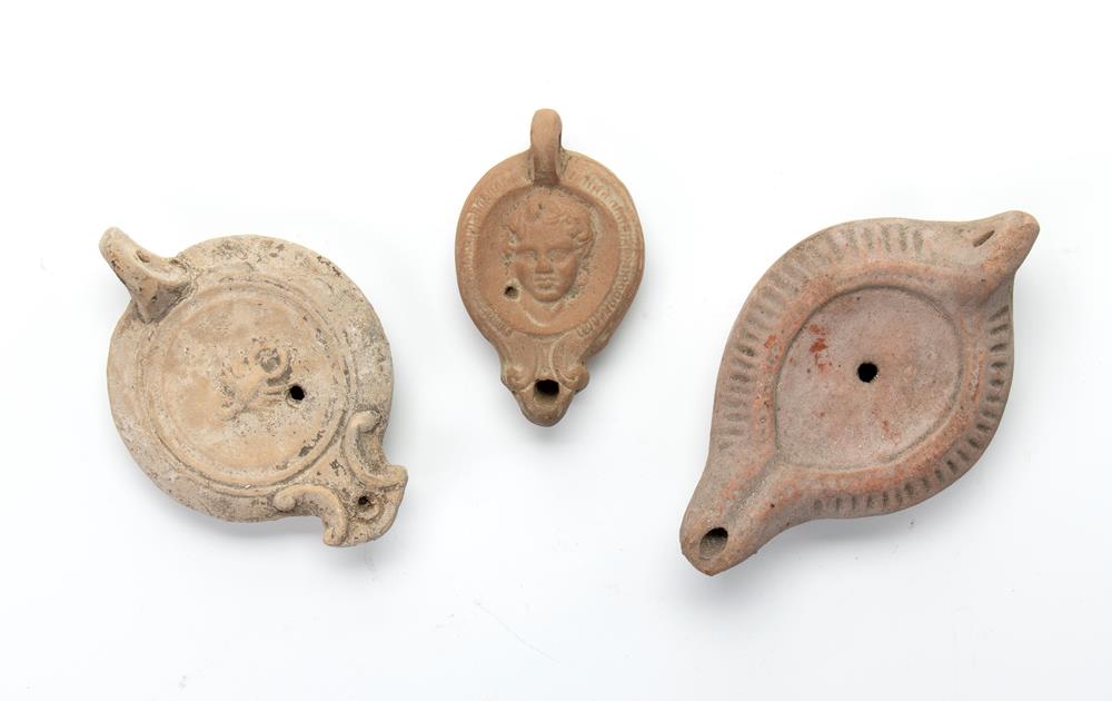 Lotto di tre lucerne in terracotta, una con decoro a rilievo a guisa di scorpione XX secolo