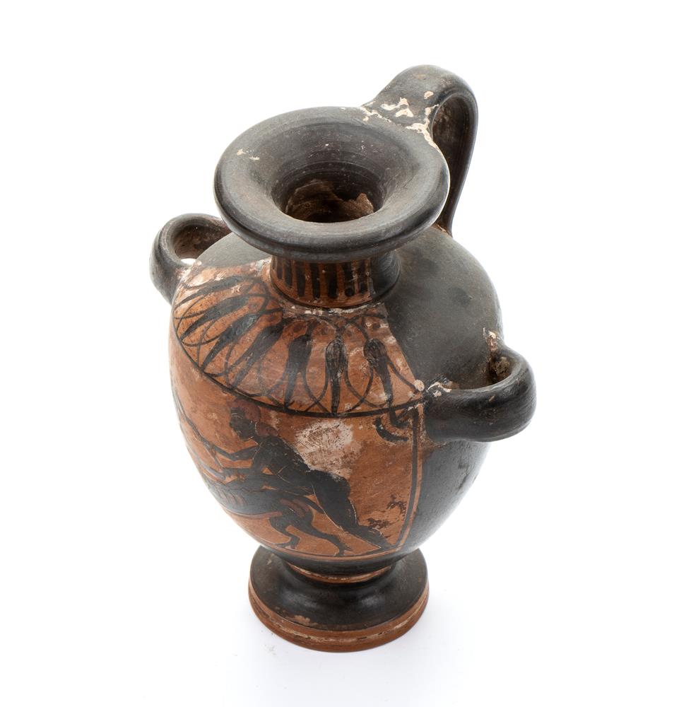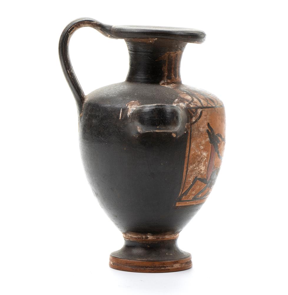Oinochoe biansato in ceramica arcaica a figure nere con scena venatoria