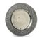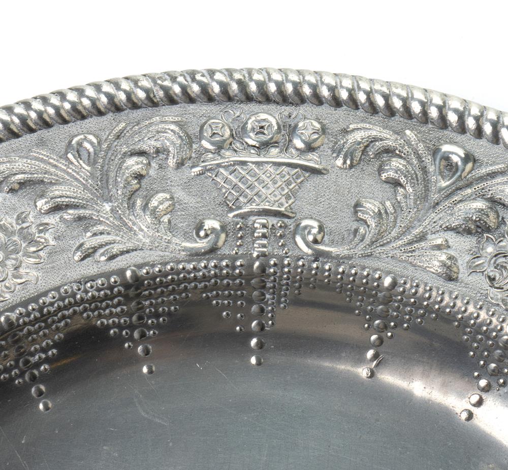 Vassoio rotondo in metallo argentato con tesa decorata a rilievo da cornucopie tra racemi