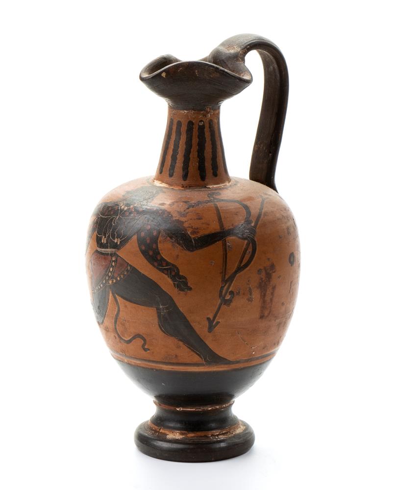 Piccolo oinochoe in ceramica arcaica a figure nere con becco carenato con arciere a 4 braccia XX secolo