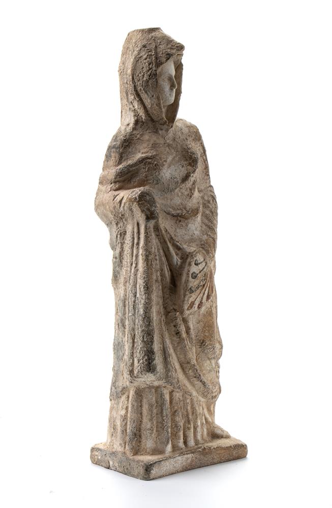 Tanagrina in terracotta (un tempo recante in testa una thoila, tipico cappello a punta) con kekriphalos che le avvolge il capo