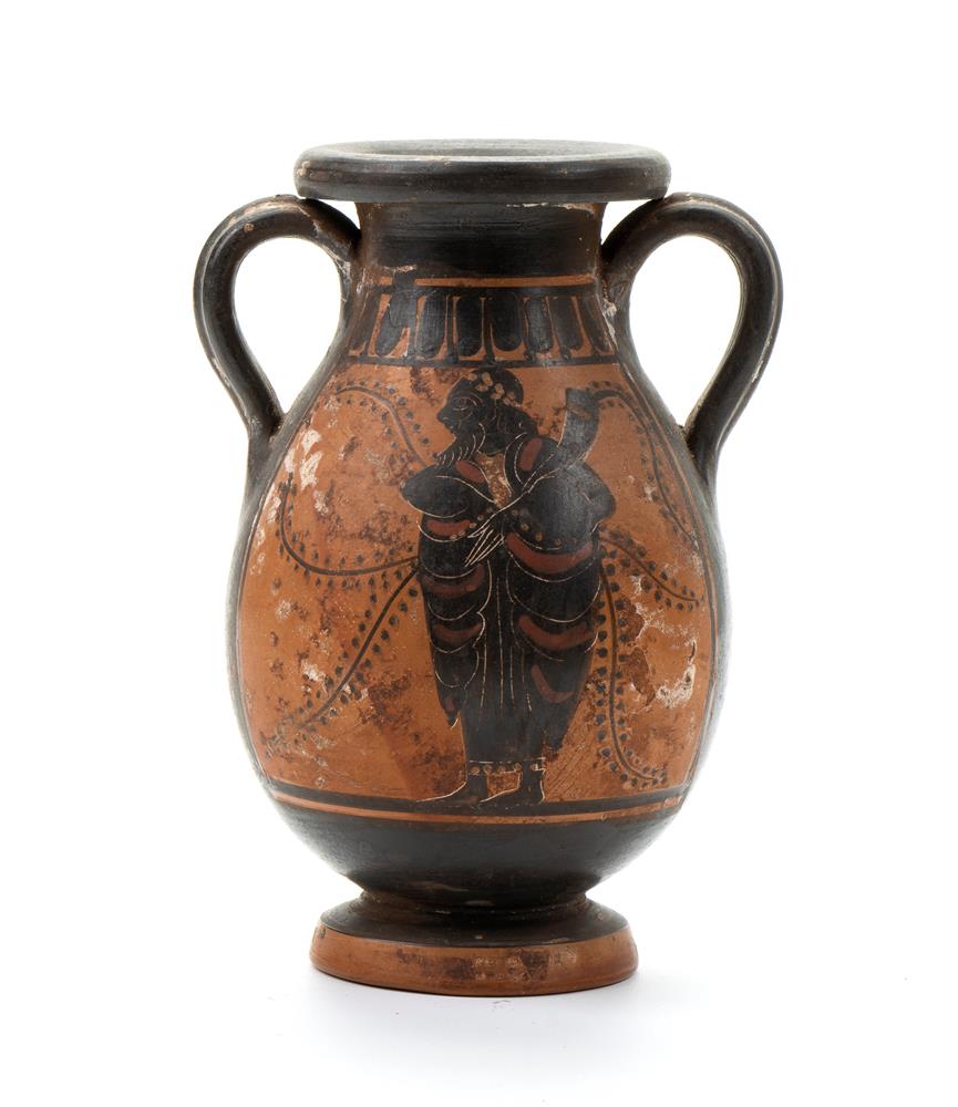 Piccola anfora in ceramica arcaica a figure nere con figura femminile seduta con tridente e al retro figura togata con cornucopia XX secolo