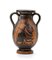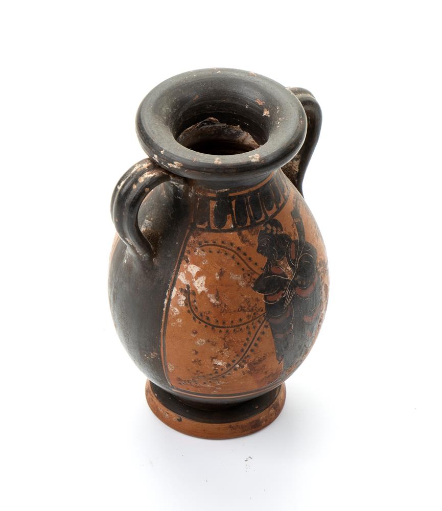Piccola anfora in ceramica arcaica a figure nere con figura femminile seduta con tridente e al retro figura togata con cornucopia