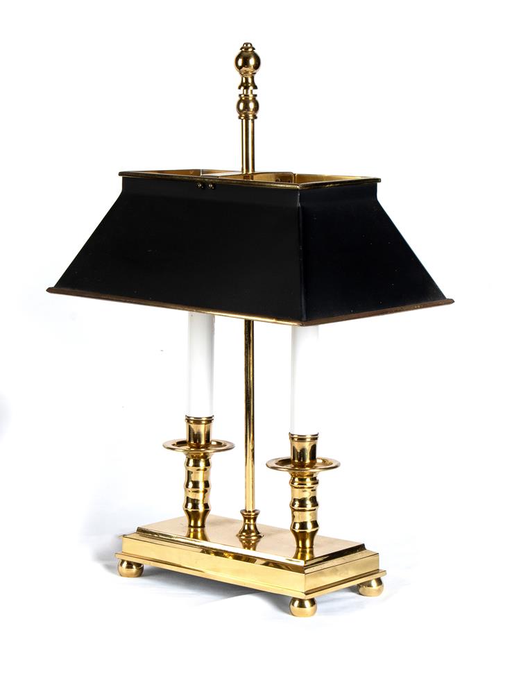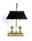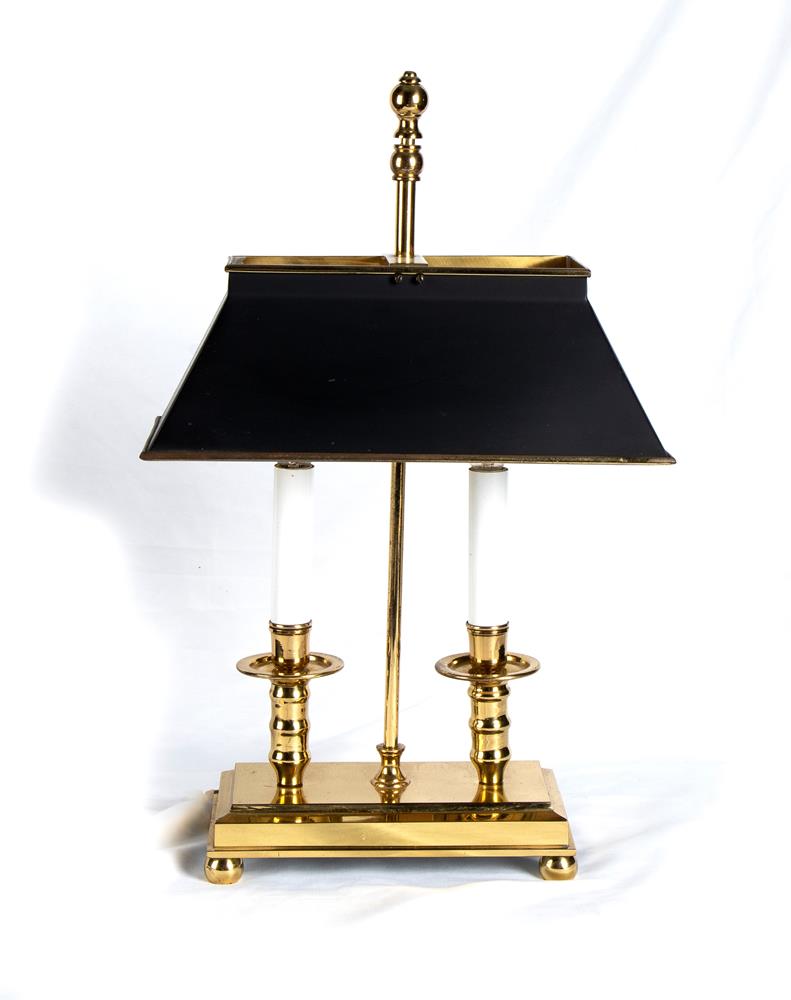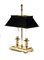 Lampada da scrittoio in ottone a due luci montate a guisa di candele. Diffusore originale in metallo patinato nero.