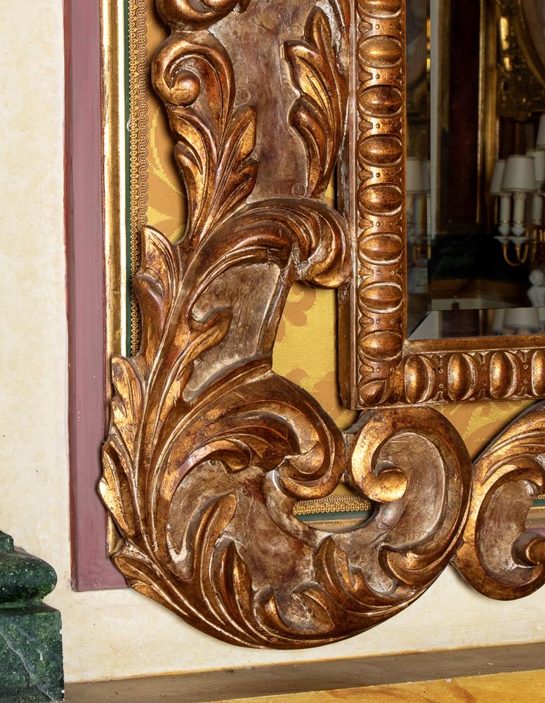 Grande specchiera in legno dorato ed intagliato con ricco gioco di volute fogliate alla cornice.