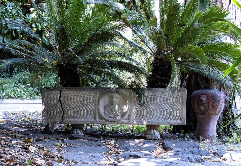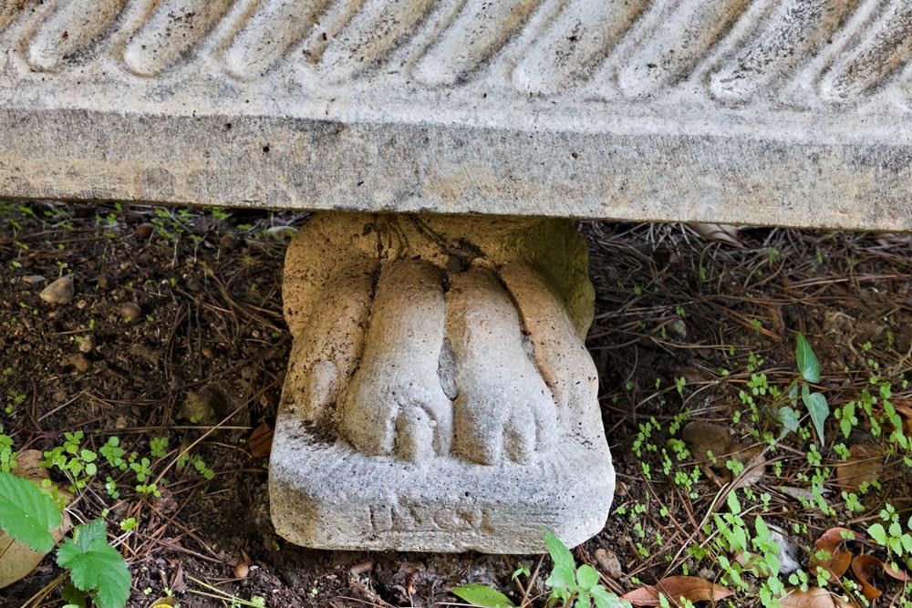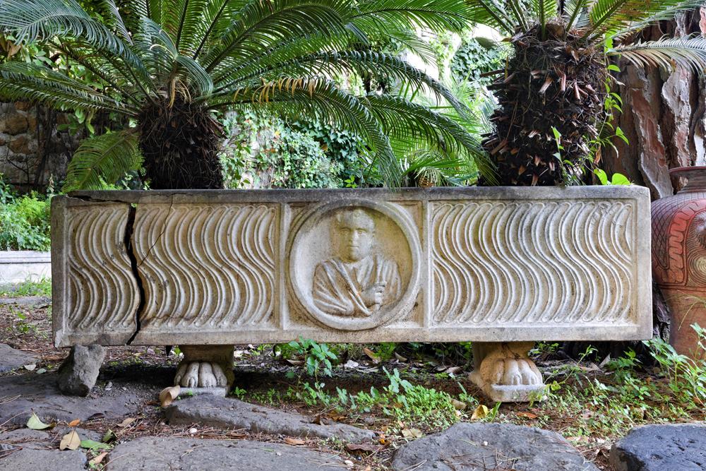 Sarcofago strigilato realizzato ad imitazione romana con piedi ferini e cammeo centrale raffigurante senatore