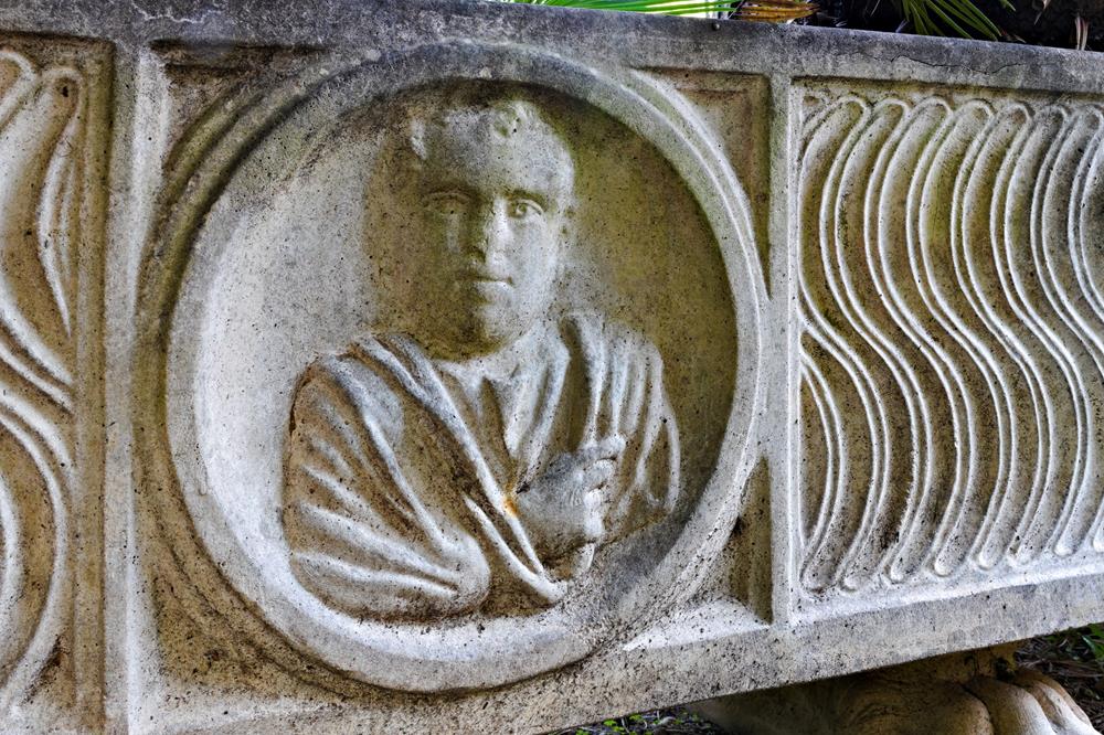 Sarcofago strigilato realizzato ad imitazione romana con piedi ferini e cammeo centrale raffigurante senatore XX secolo