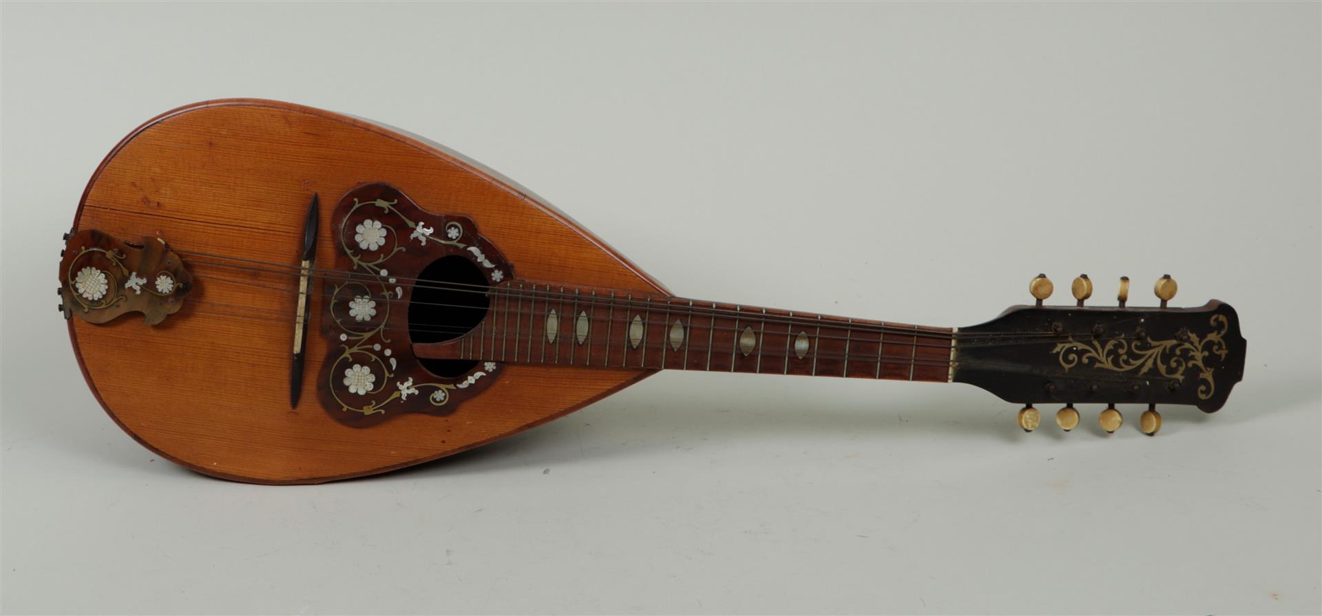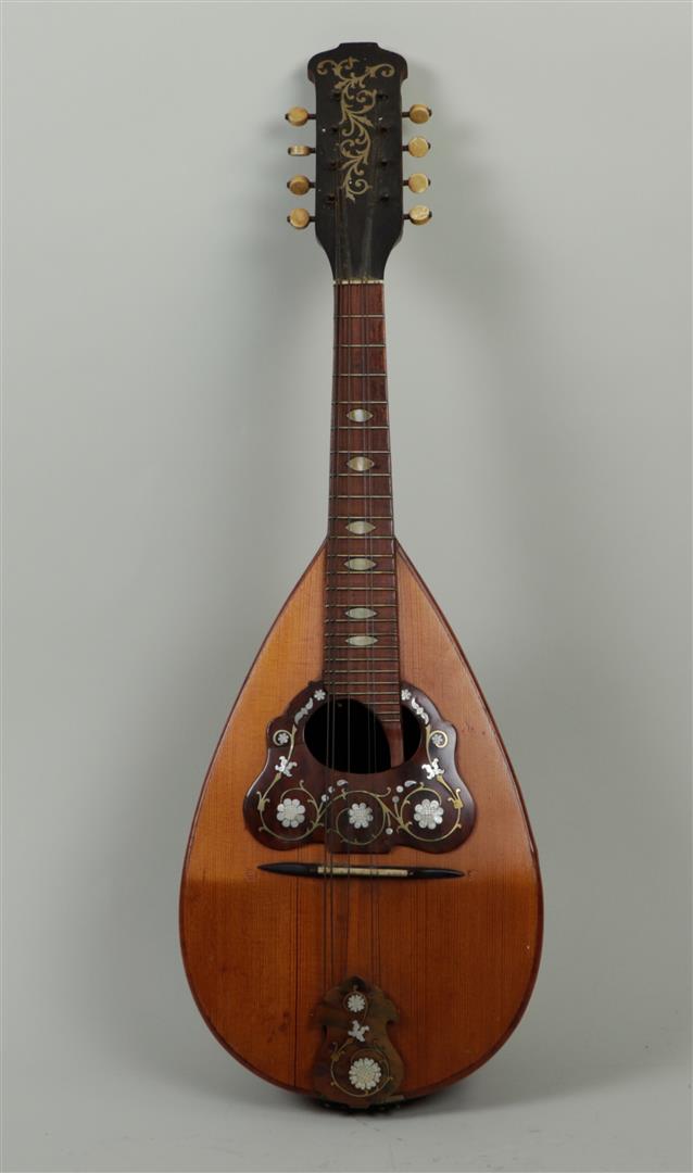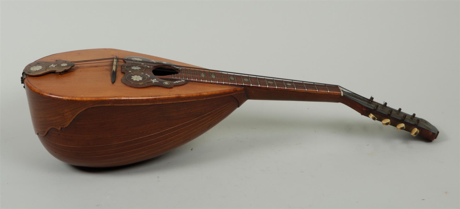 A mother-of-pearl inlaid mandolin, 19th century. Some strings missing.