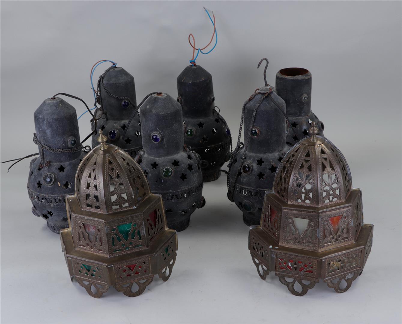 A collection of copper oriental wall and hanging lamps set with fantasy stones.