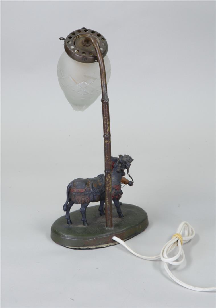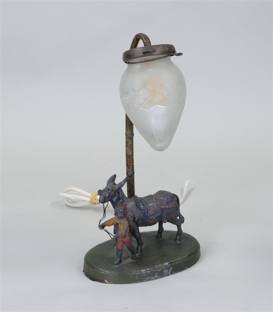 A cold-painted white metal lamp in Bergmann style.H. 32 cm.