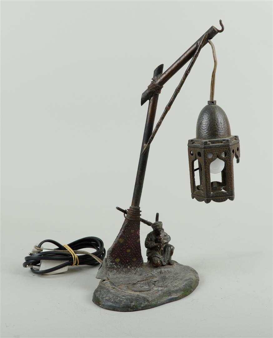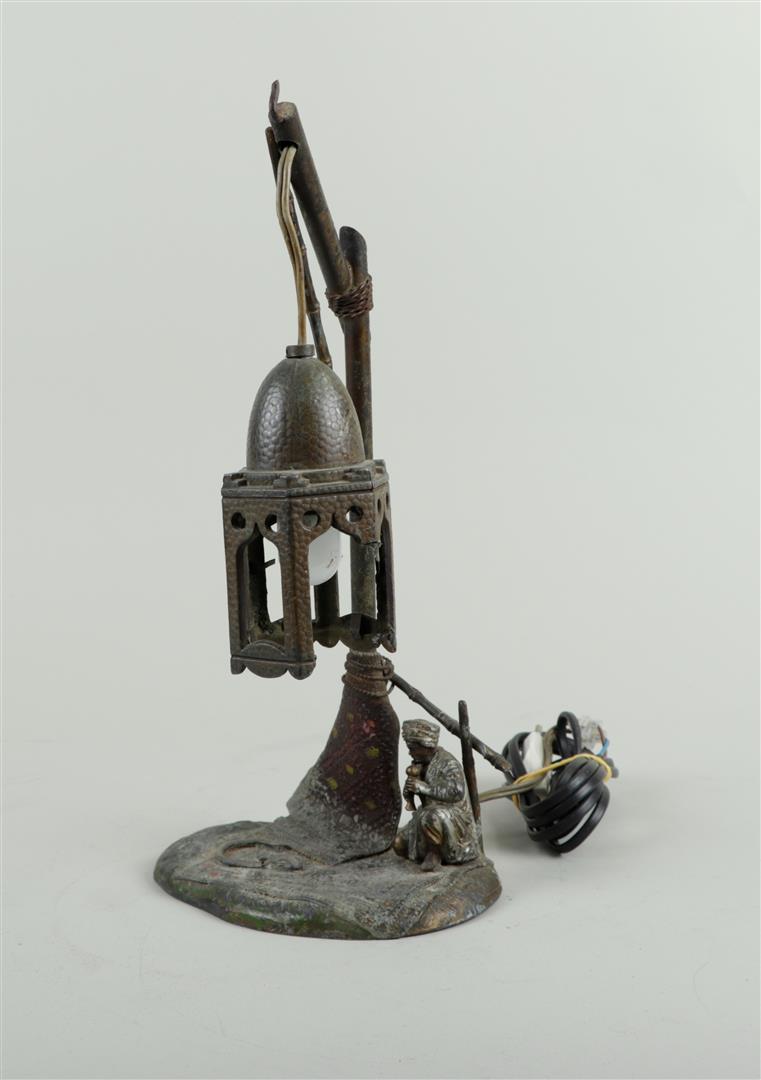 Lotto 1079 | A white metal cold painted lamp in Bergmann style. Shade is damaged.H. 37 cm.