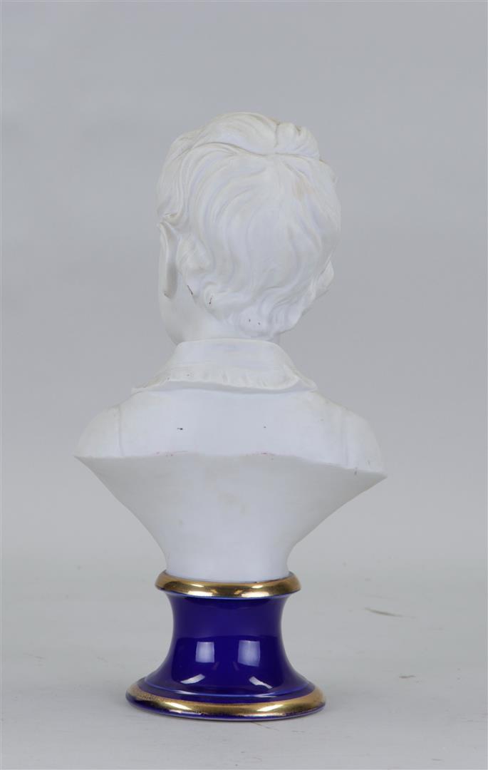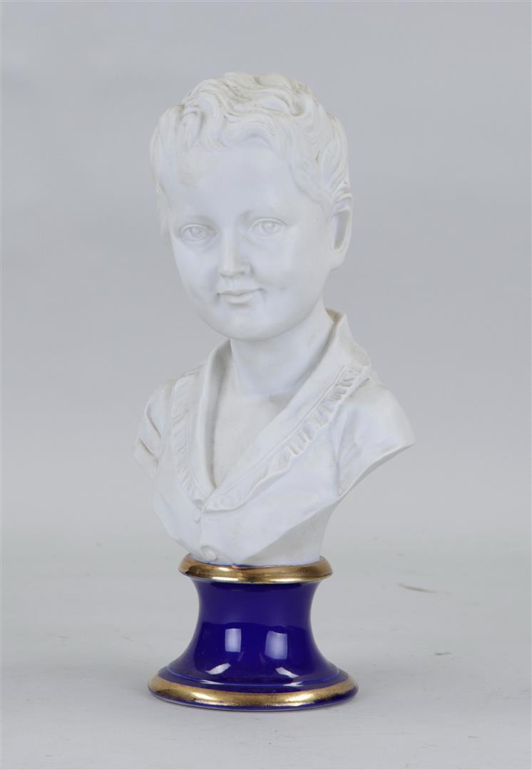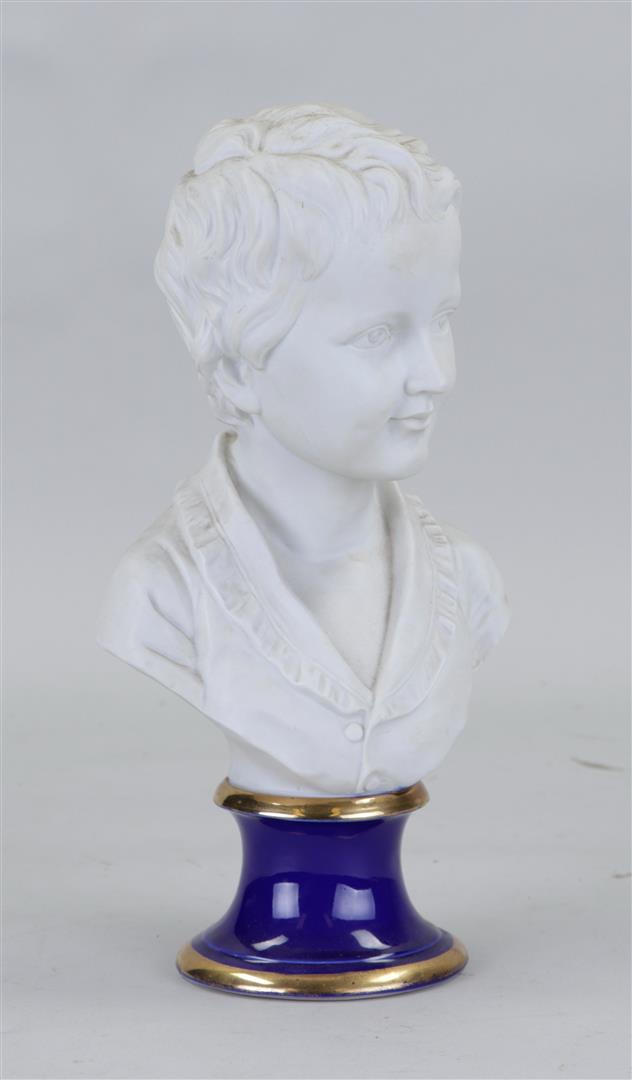 A biscuit bust of a young man on a blue porcelain base.29 x 17 cm.