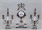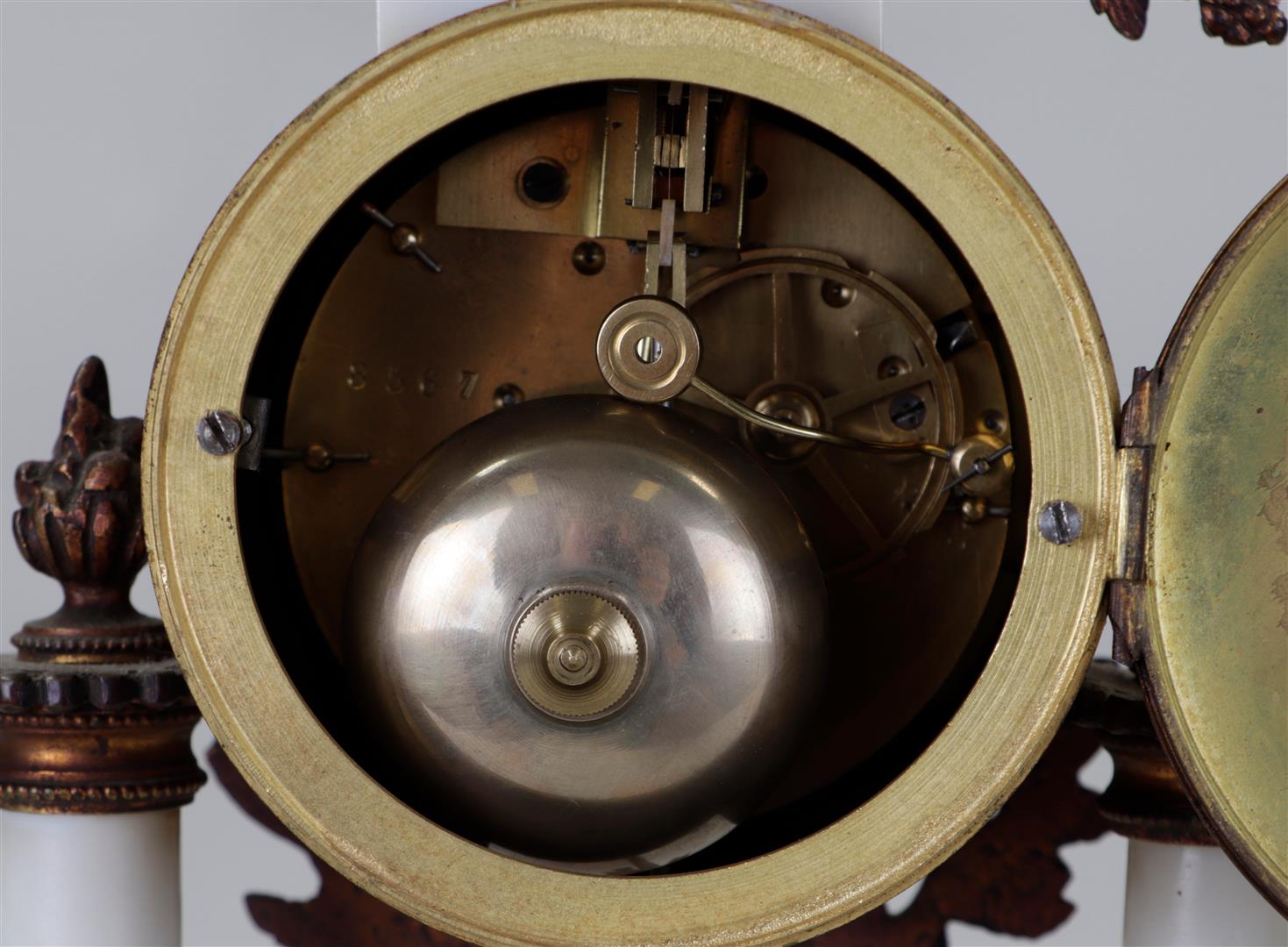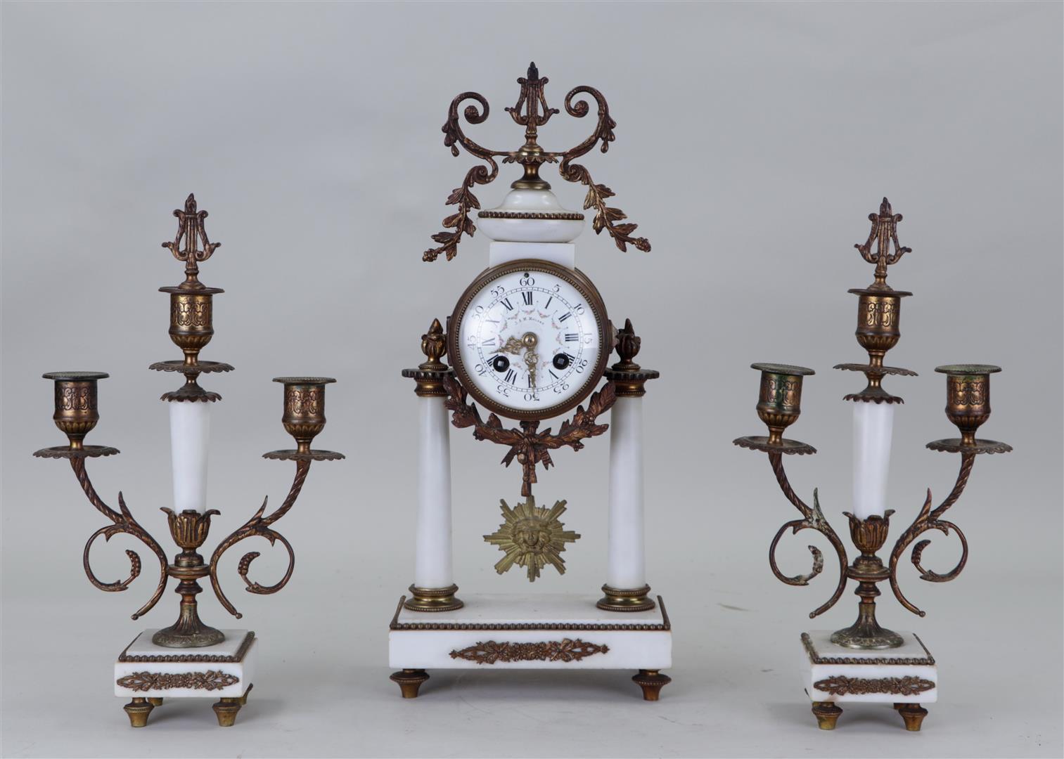 A marble Garniture de Cheminée consisting of a pendulum on a column and decorated with a garland and bronze mounts, with two candlesticks. France, 2nd half of the 19th century.