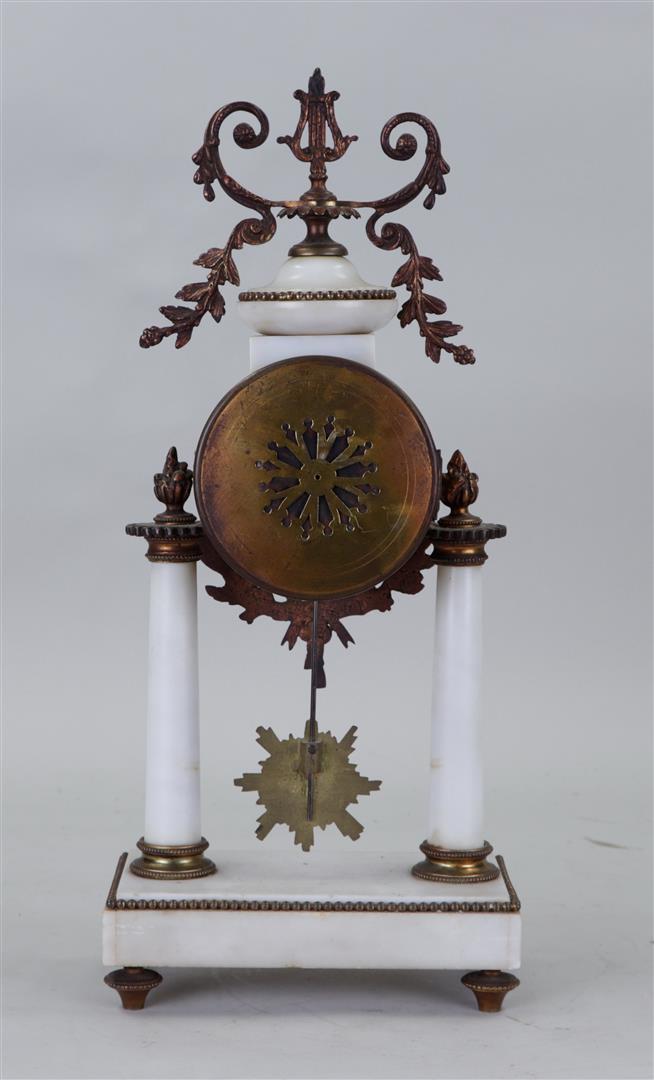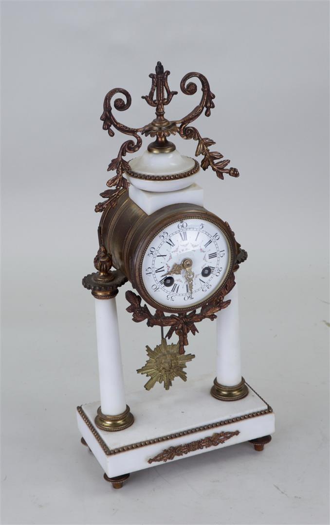A marble Garniture de Cheminée consisting of a pendulum on a column and...