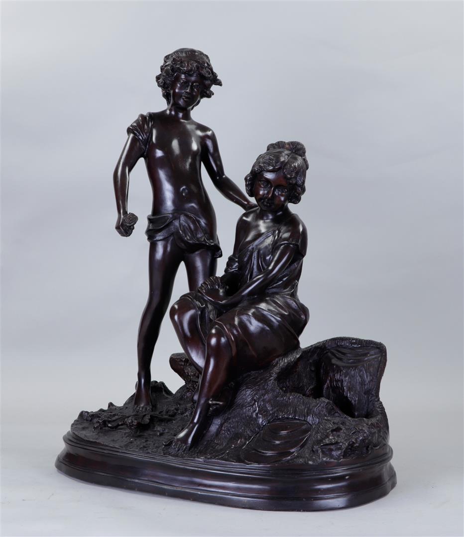 A large dark patinated bronze sculpture of a couple in love.