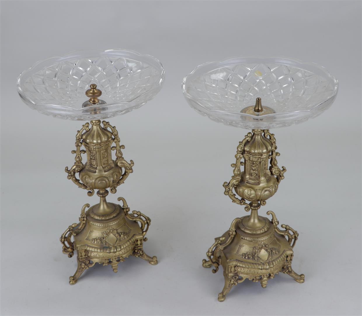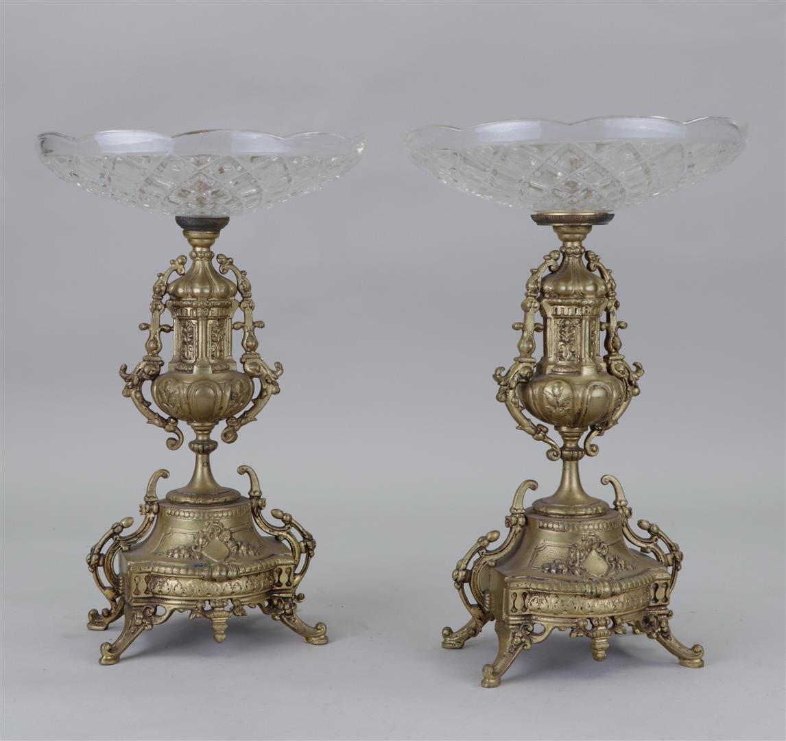 A set of two glass bowls on brass base. Late 19th century.