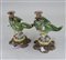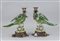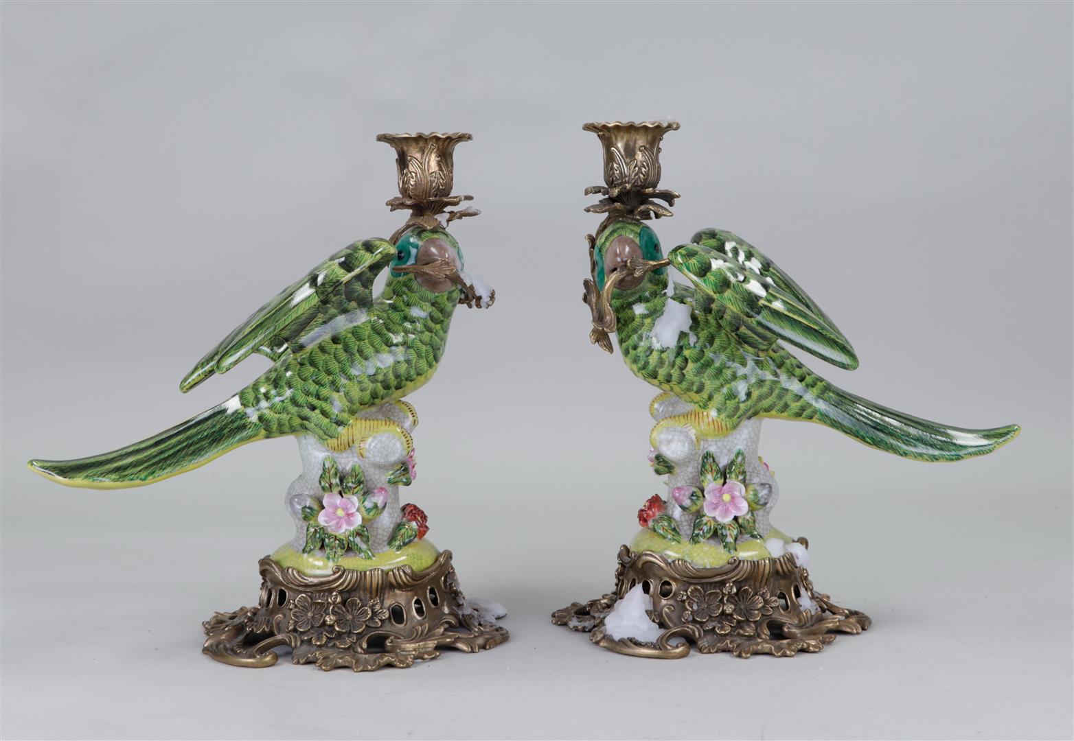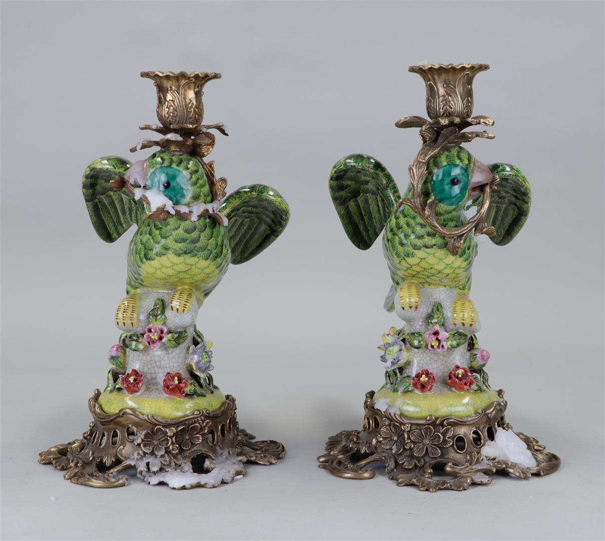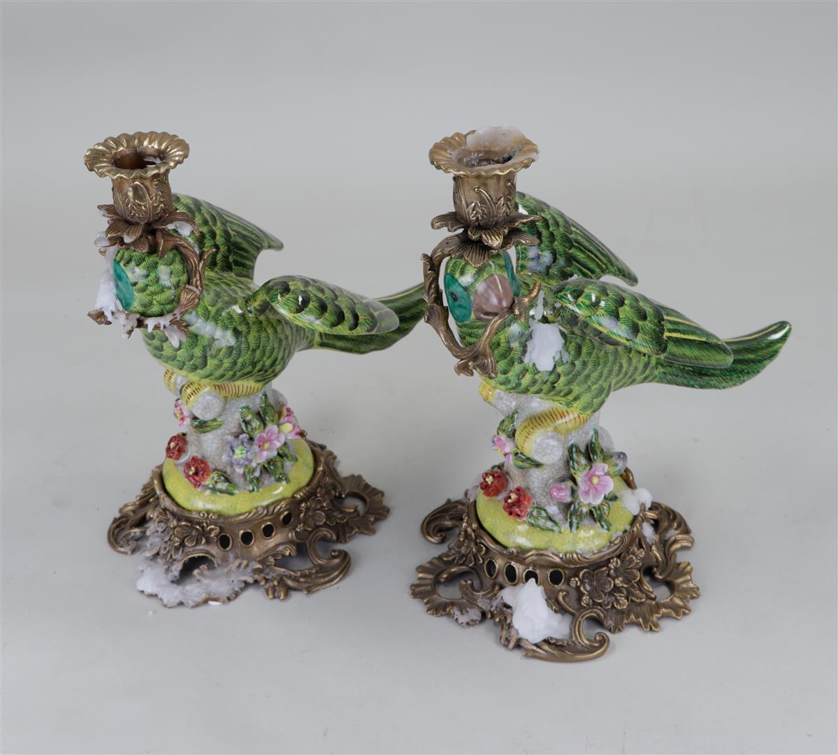 A set of polychrome painted earthenware candlesticks in the shape of a parrot, on a bronze base and candle holder.