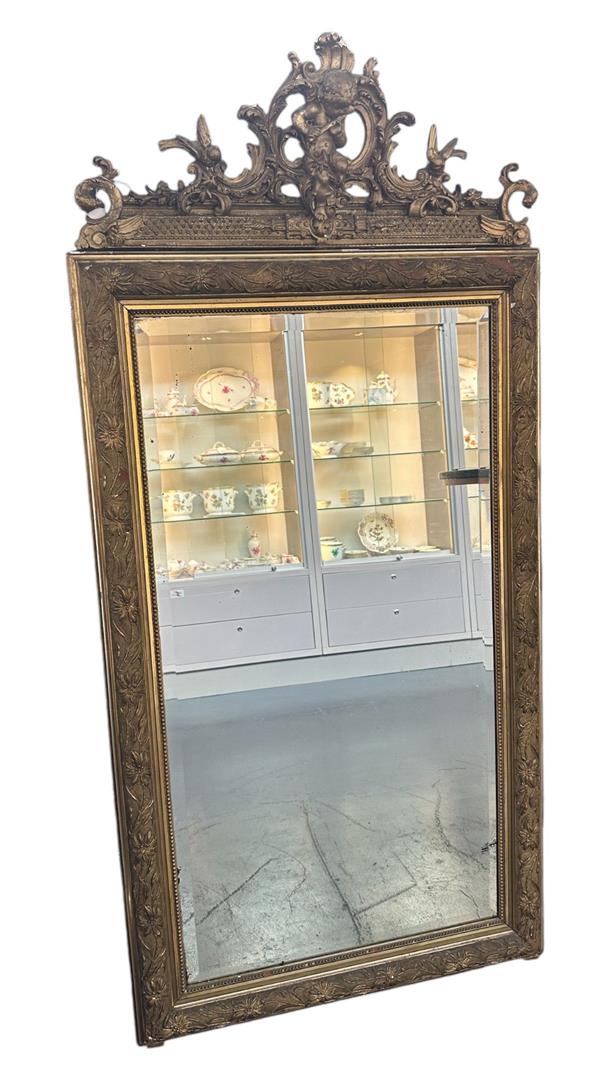 A large facet cut mirror, crest decorated with puti.170 x 60 cm.