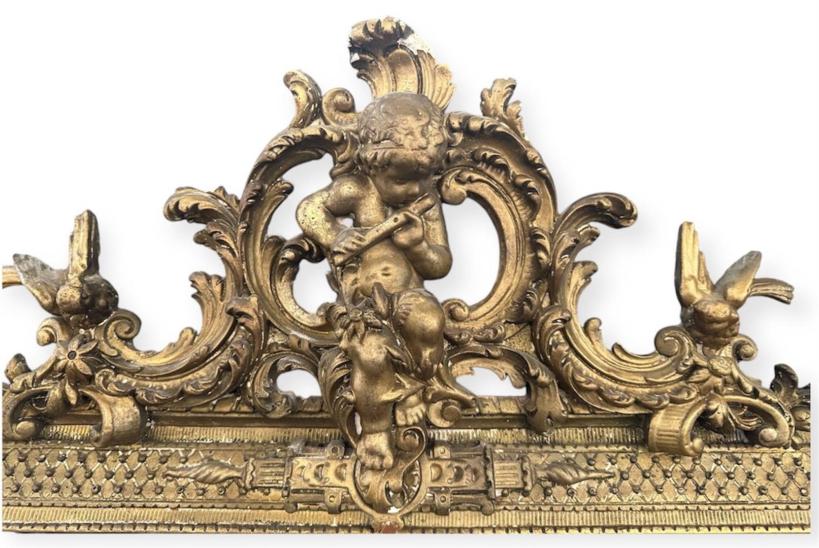 A large facet cut mirror, crest decorated with puti.