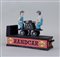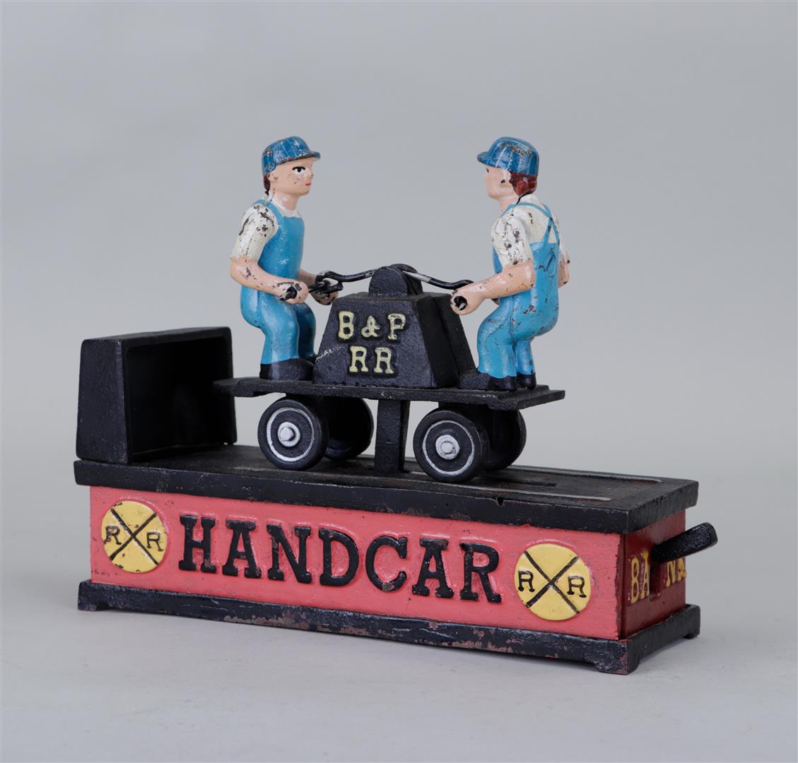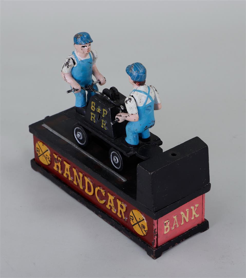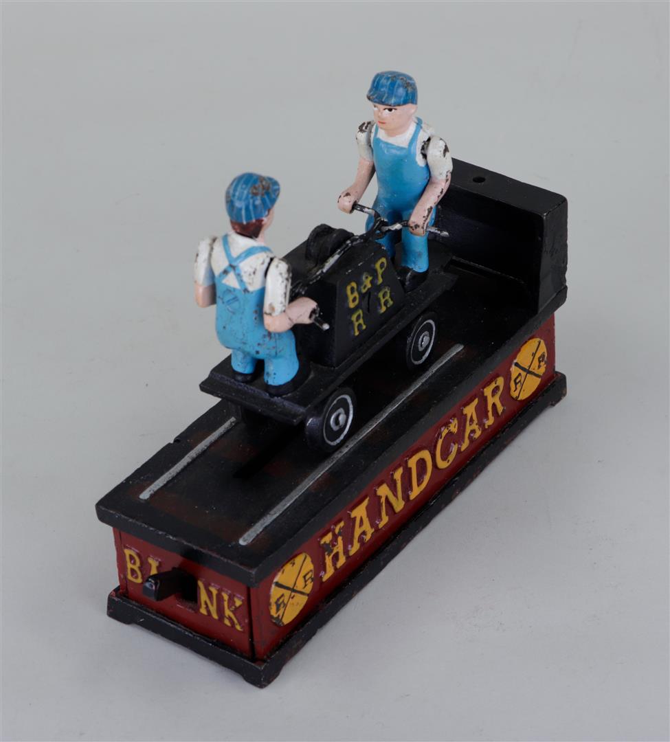 A mechanical cast iron money box 'Railroad handcar bank'.