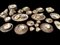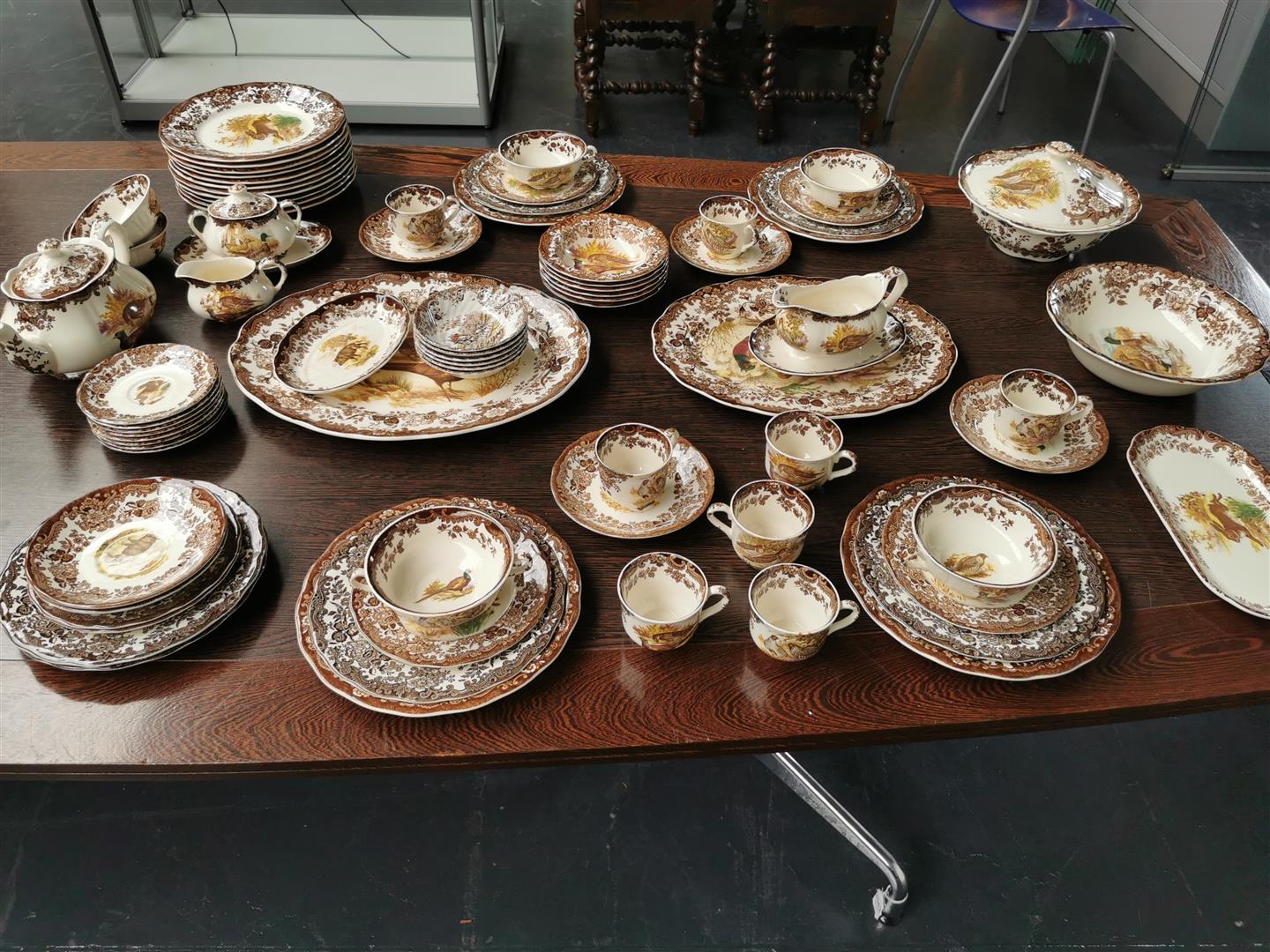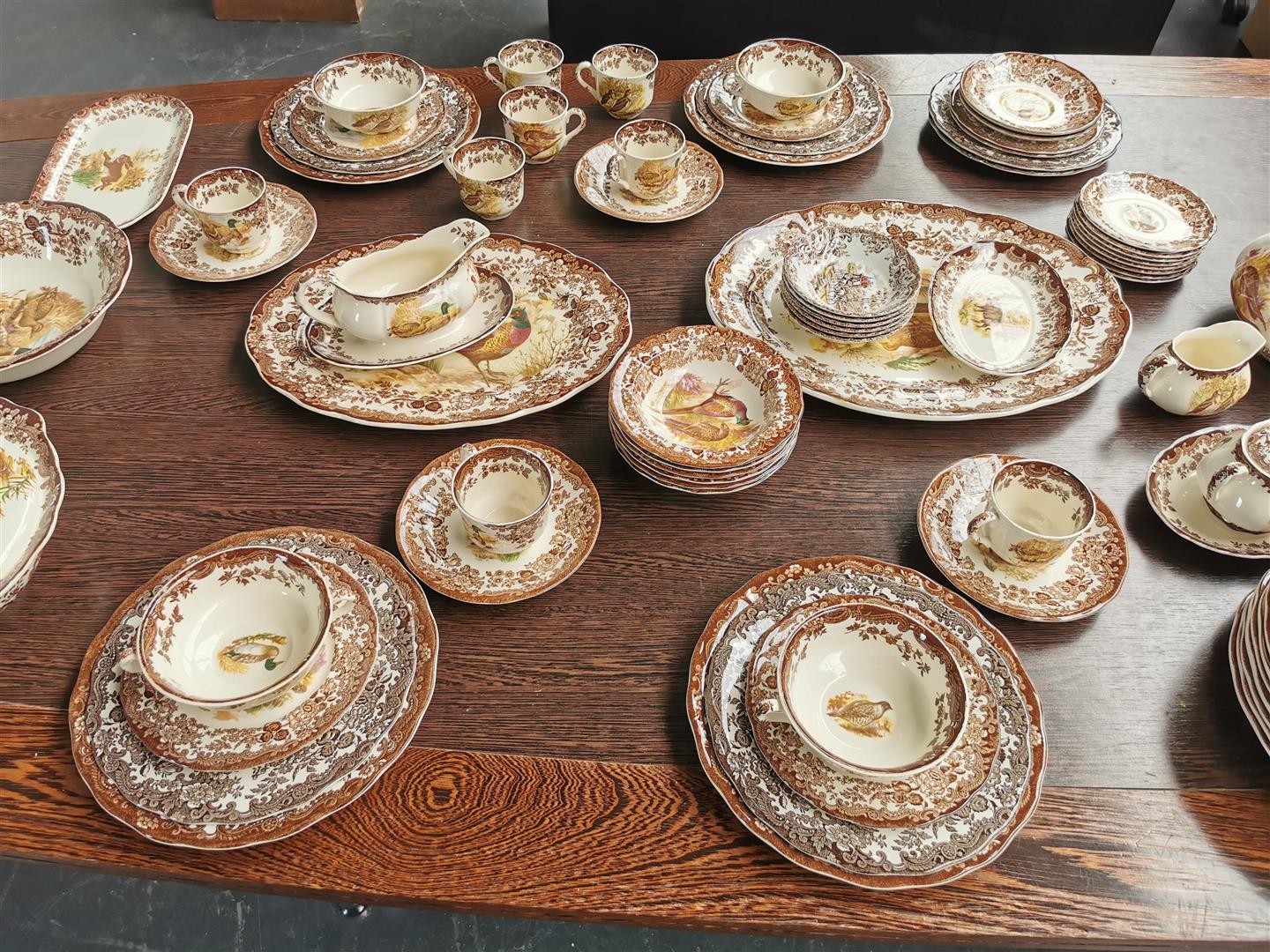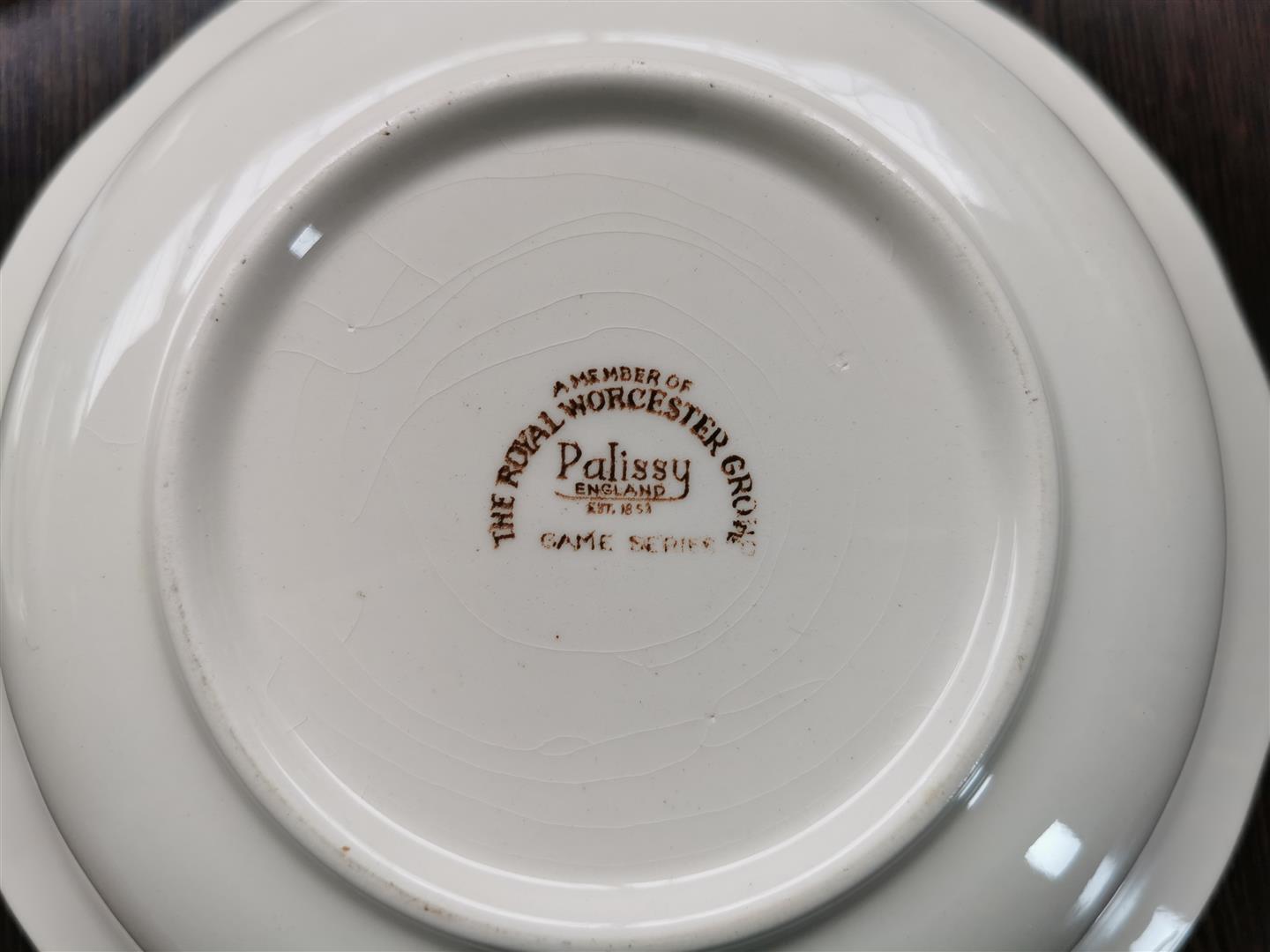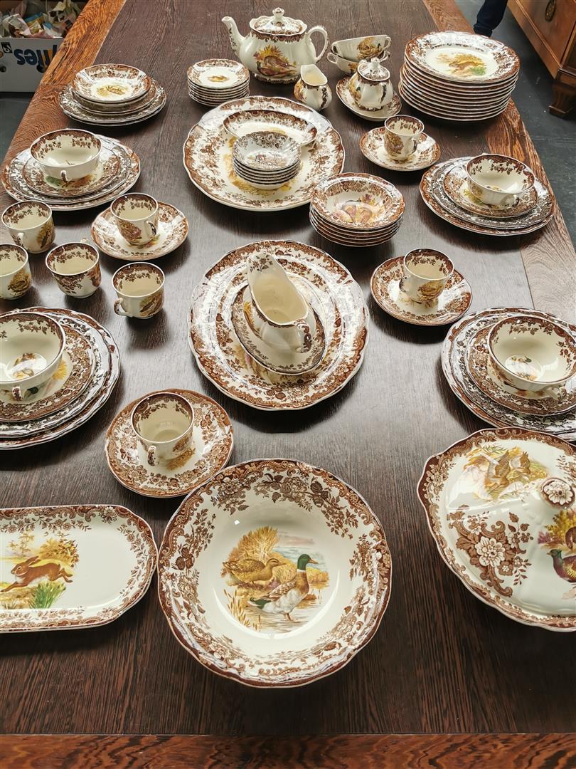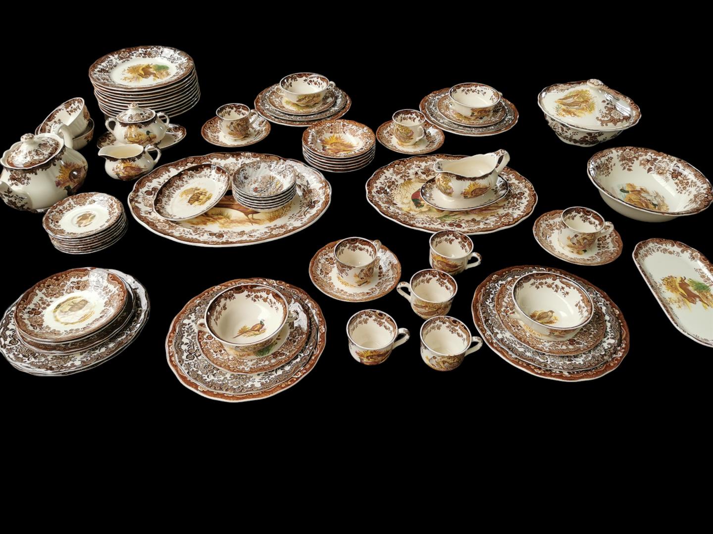A Royal Worcester Palissy 'game series' earthenware tableware. consisting of 8 cups and saucers, 6 soup bowls, 1 tea pot, 1 milk jug, 1 sugar bowl, 1 gravy bowl, 2 small meat bowls, 1 presentation bowl, 1 salad bowl, 1 covering bowl, 2 large flat bowls, 6 dessert bowls, 6 sandwich plates, 6 small dessert plates, 15 large flat plates.