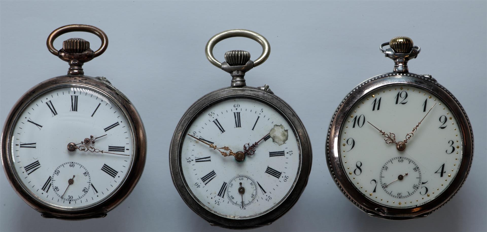 Lot with steel and silver men's pocket watches in various conditions - gross weight: 210 grams.