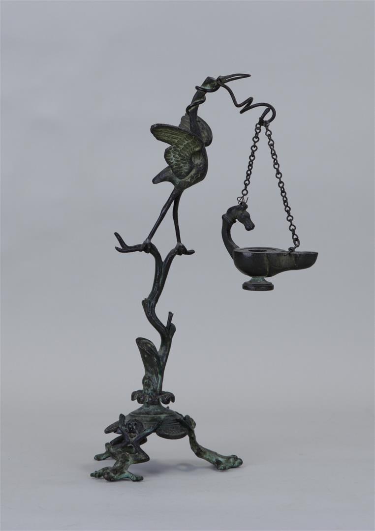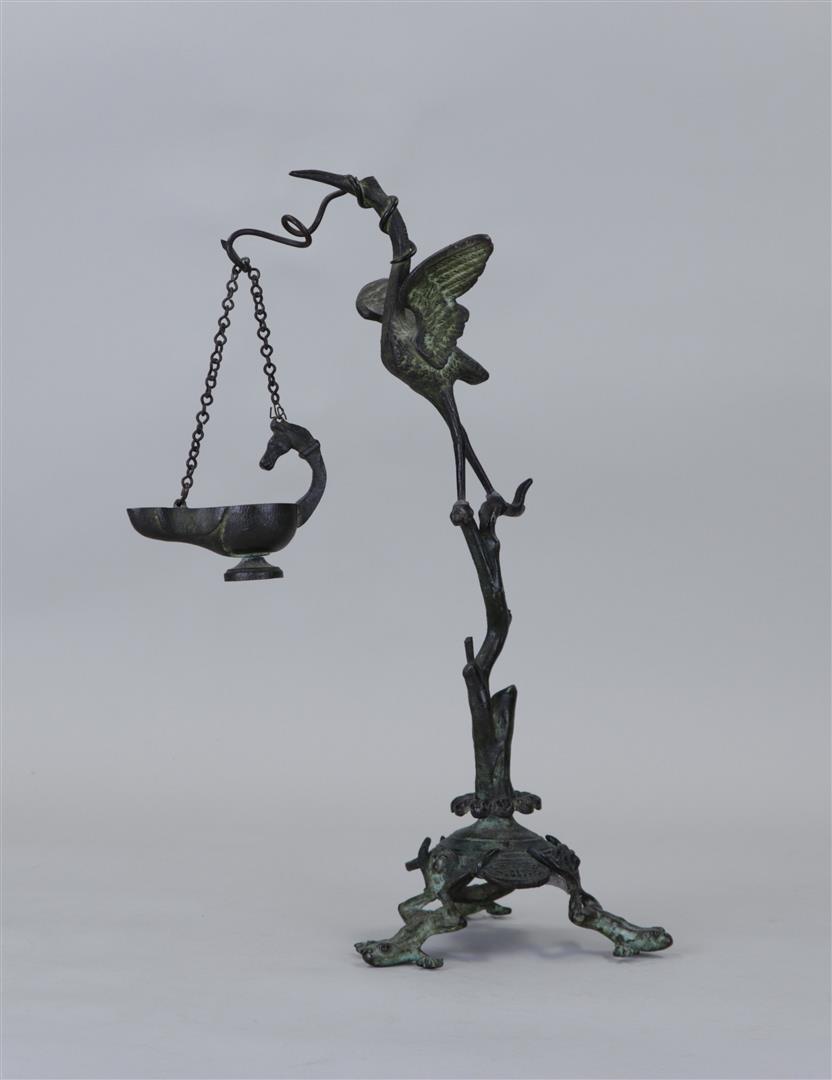 A bronze oil lamp decorated with a crane and frogs. Japan, 19/20th century.H....