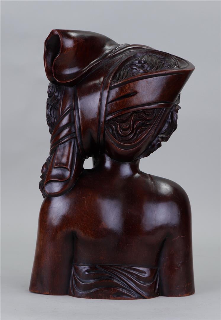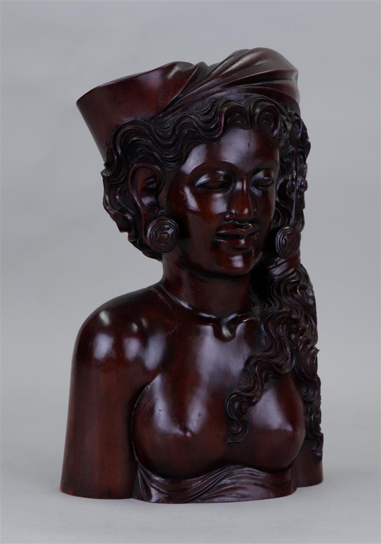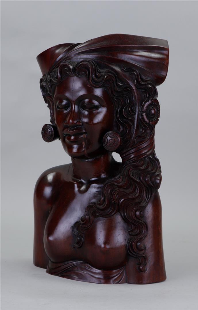 A large hand carved wooden bust of a lady, signed A. Fatimah - Bali. Bali, Mid 20th century.