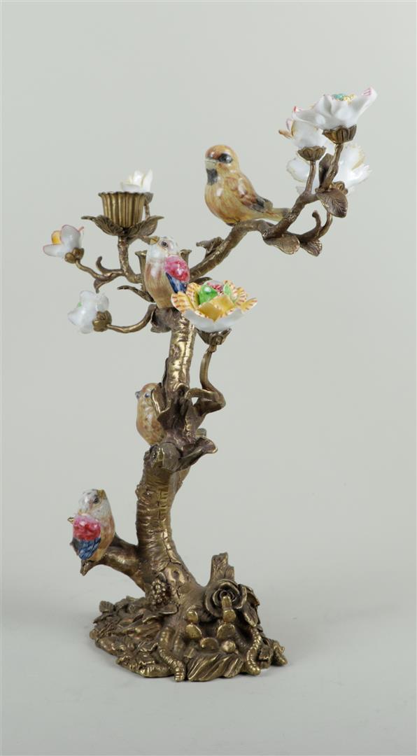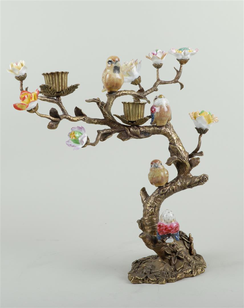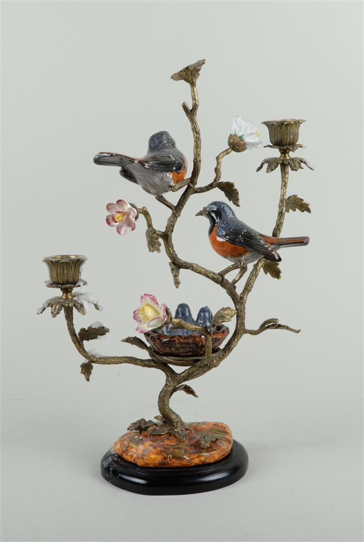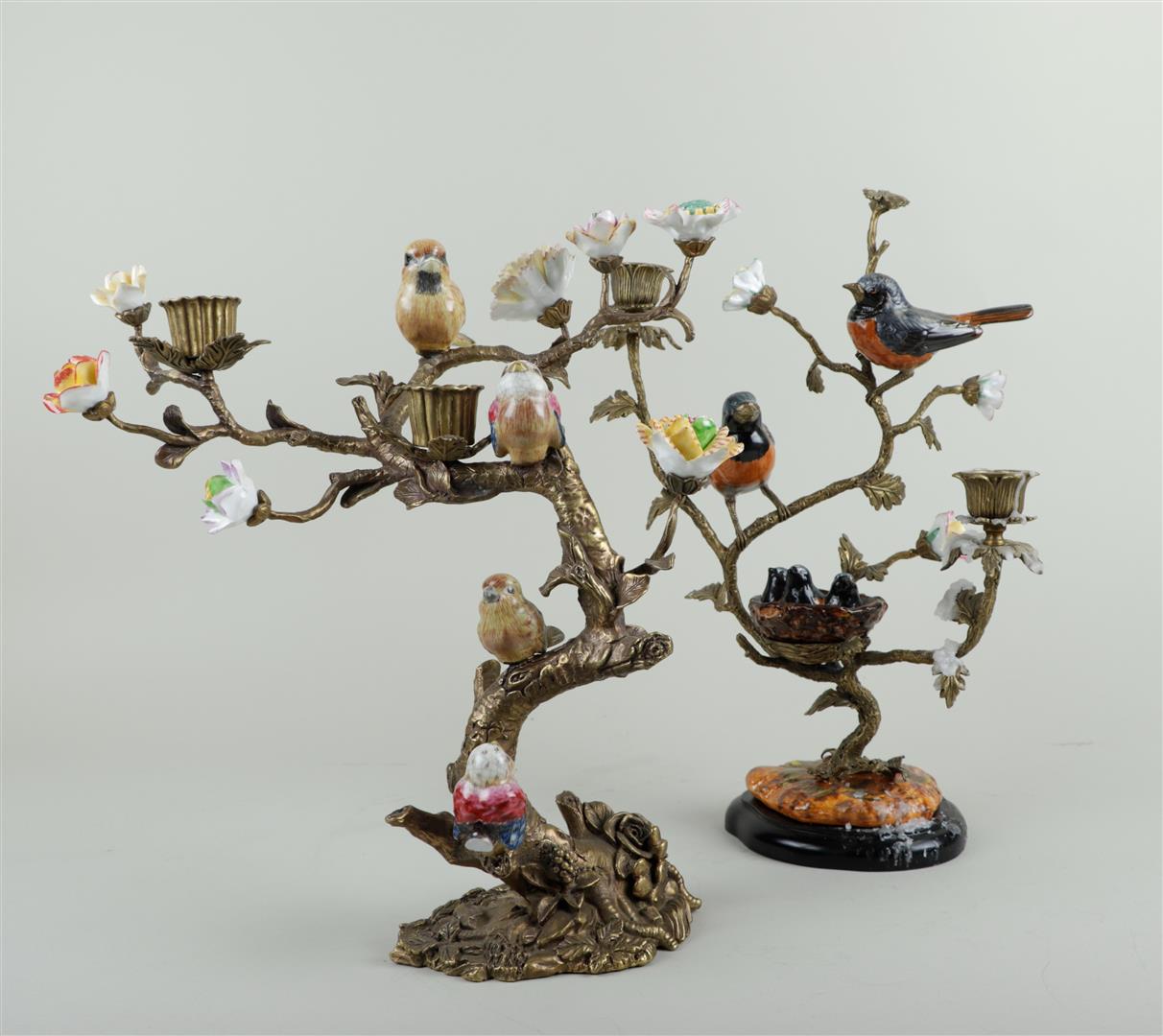 Two bronze candlesticks decorated with various earthenware birds. One bird is...