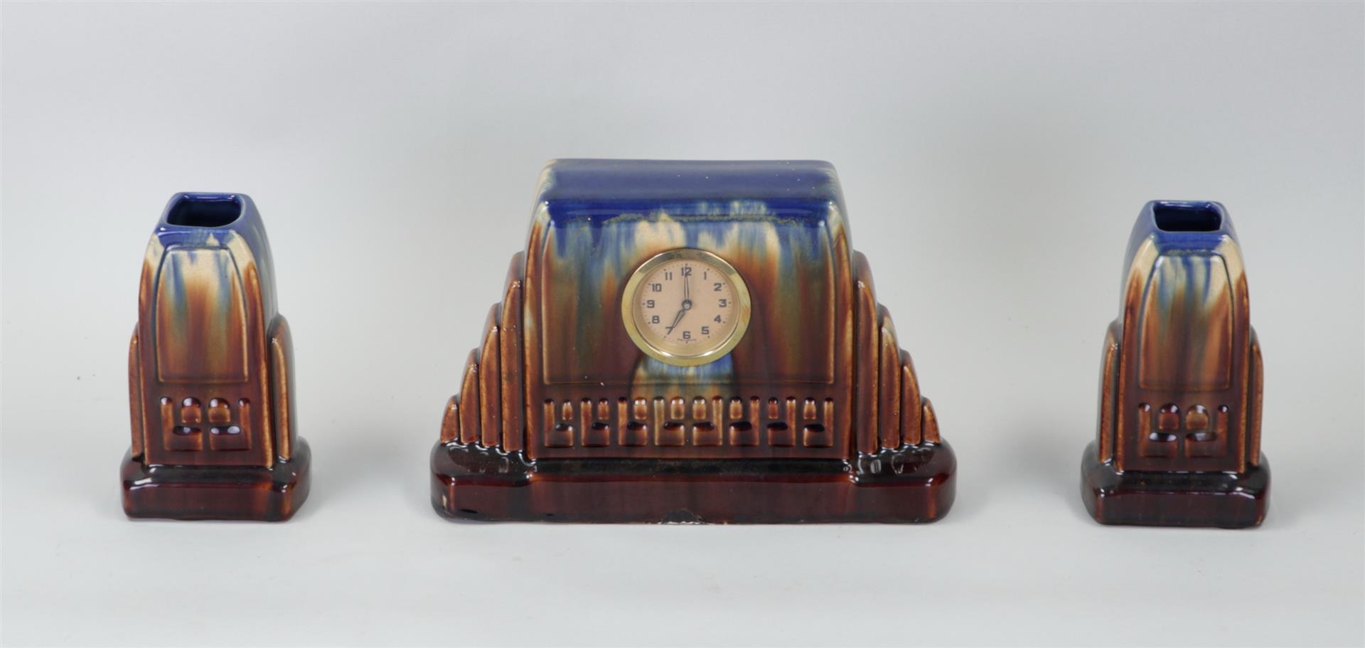A Flemish earthenware blue glazed Art Deco mantelpiece set.H. 22 cm.