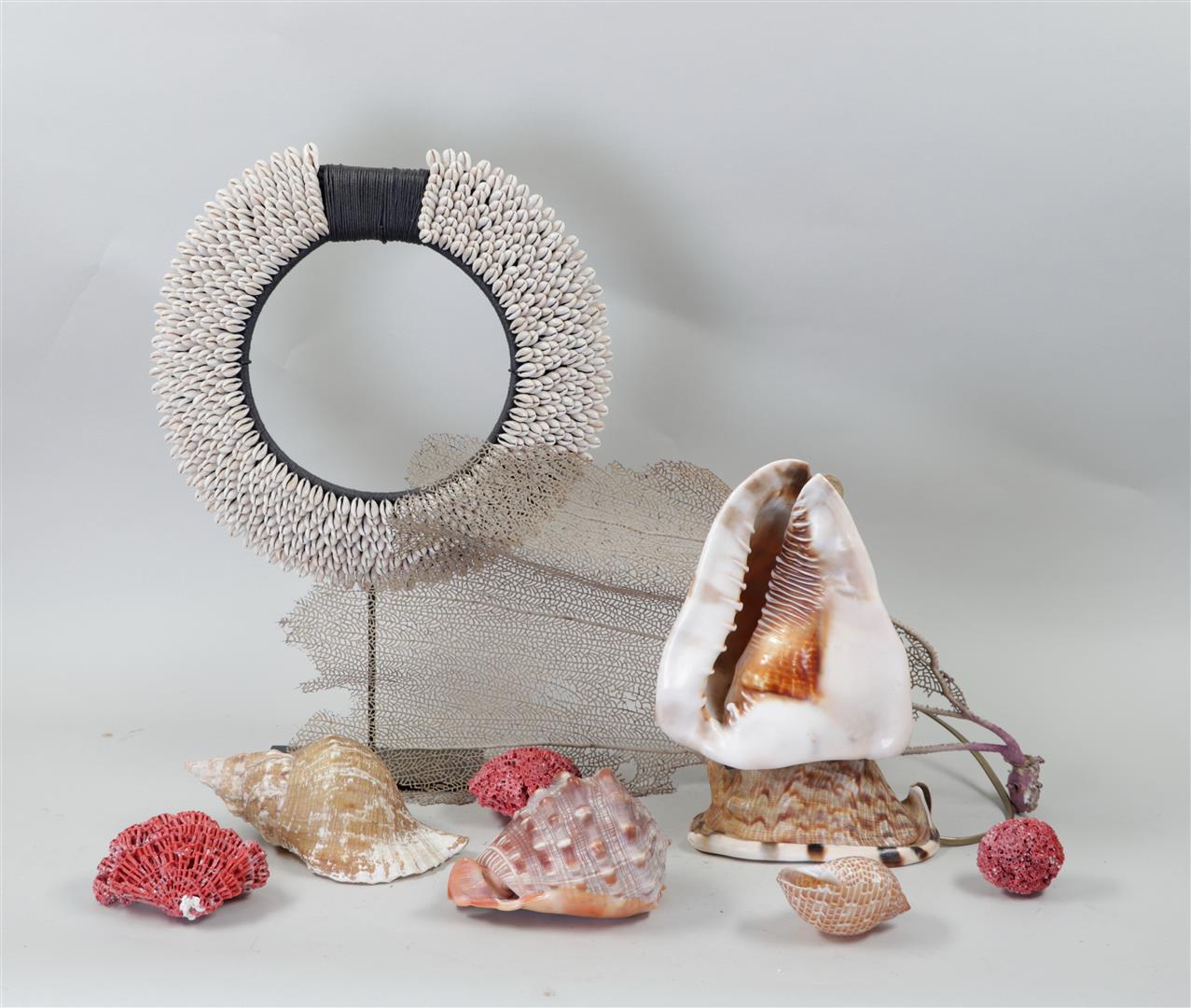 A collection of shells, one of which has been converted into a table lamp, along with a shell wreath (Papua New Guinea) on a stand and two corals.