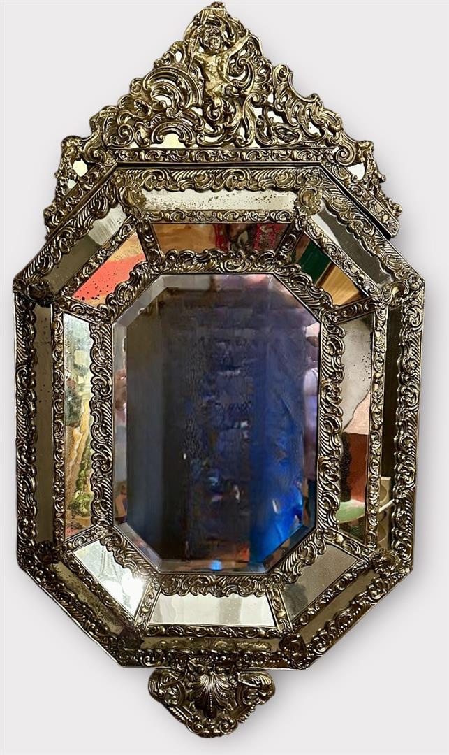 A 19th century "Venetian" octagonal pressed copper wall mirror with Jupiter figure at the top. The glass is original.