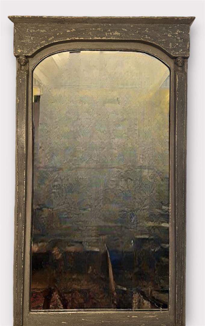A grey-overpainted, Empire mantel mirror, with charyatids on either side. Early 19th century. The glass is original.