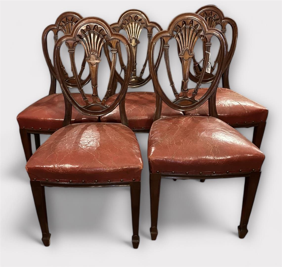 A set of (5) Hepplewhite dining chairs, upholstered in red leather, England, 18th century. Back: 97 cm. and seat 46 cm.