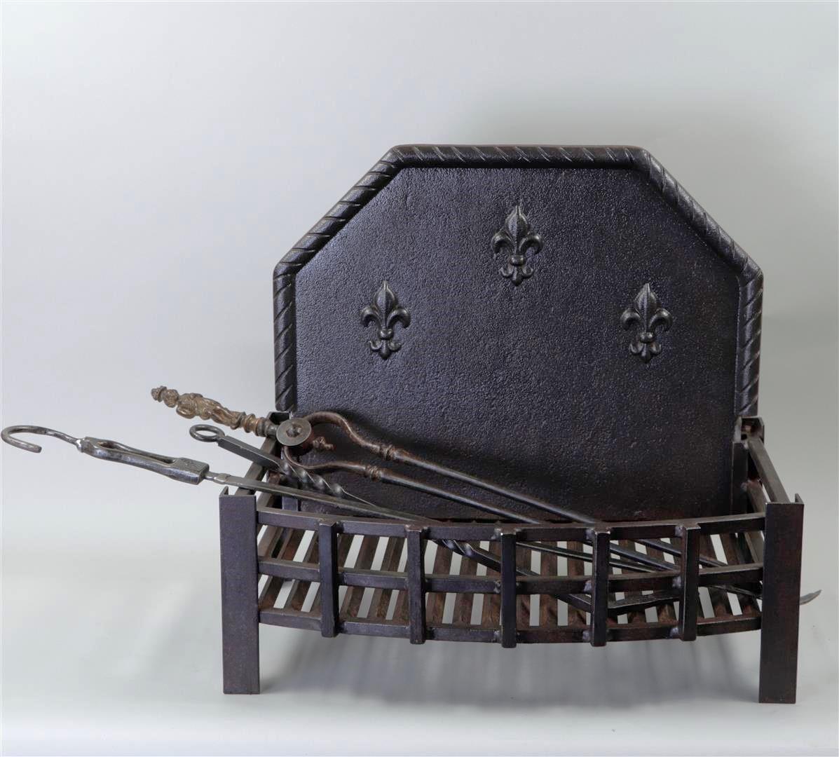 A cast iron fire bowl with hearth plate with fleurs des lis motifs, with a fireplace set. 19th century.